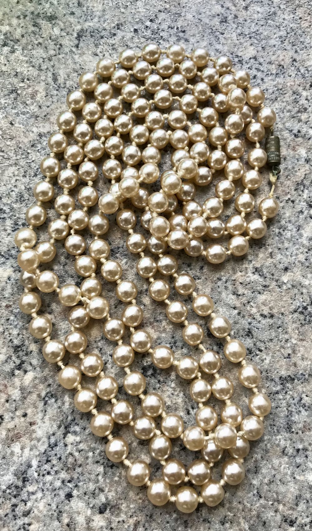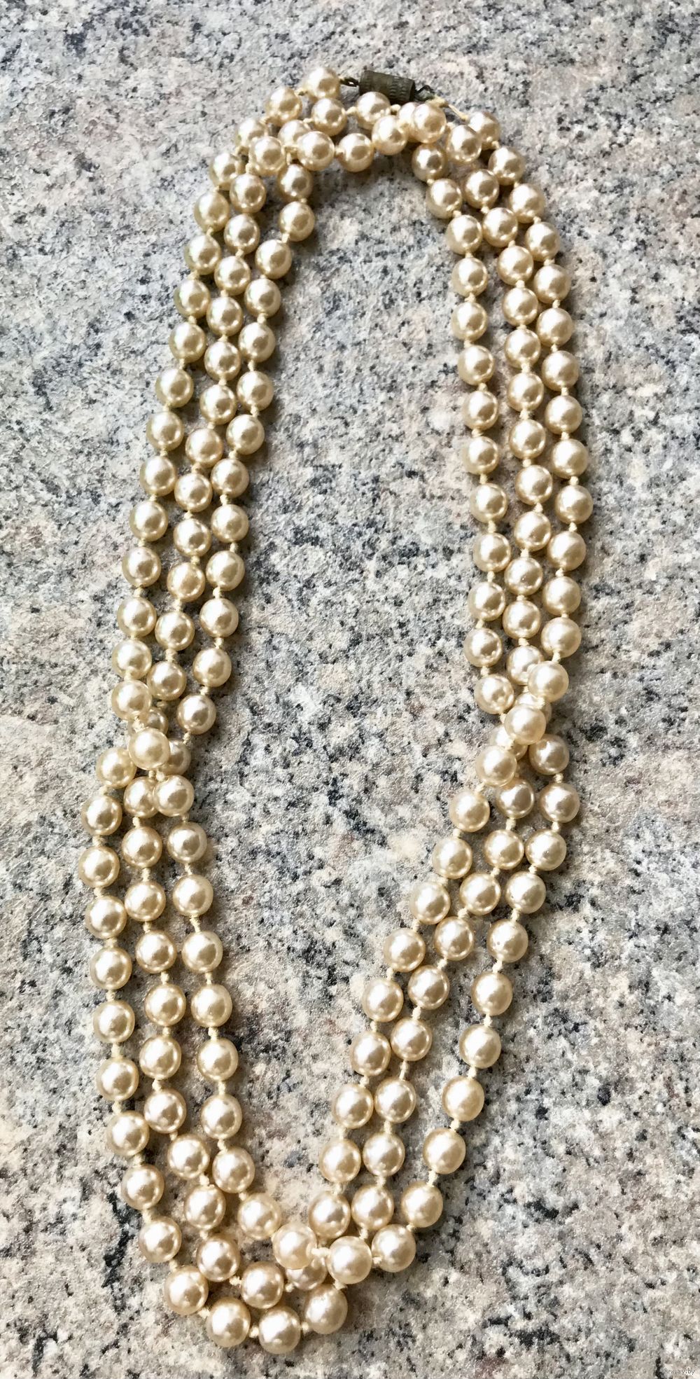 Винтажные бусы из чешского стекла под жемчуг. Длина 146см., диаметр бусины ~0,7см. На нескольких бусинах есть незначительные потёртости покрытия. В носке не заметно, учтено в цене. Общее состояние украшения хорошее.