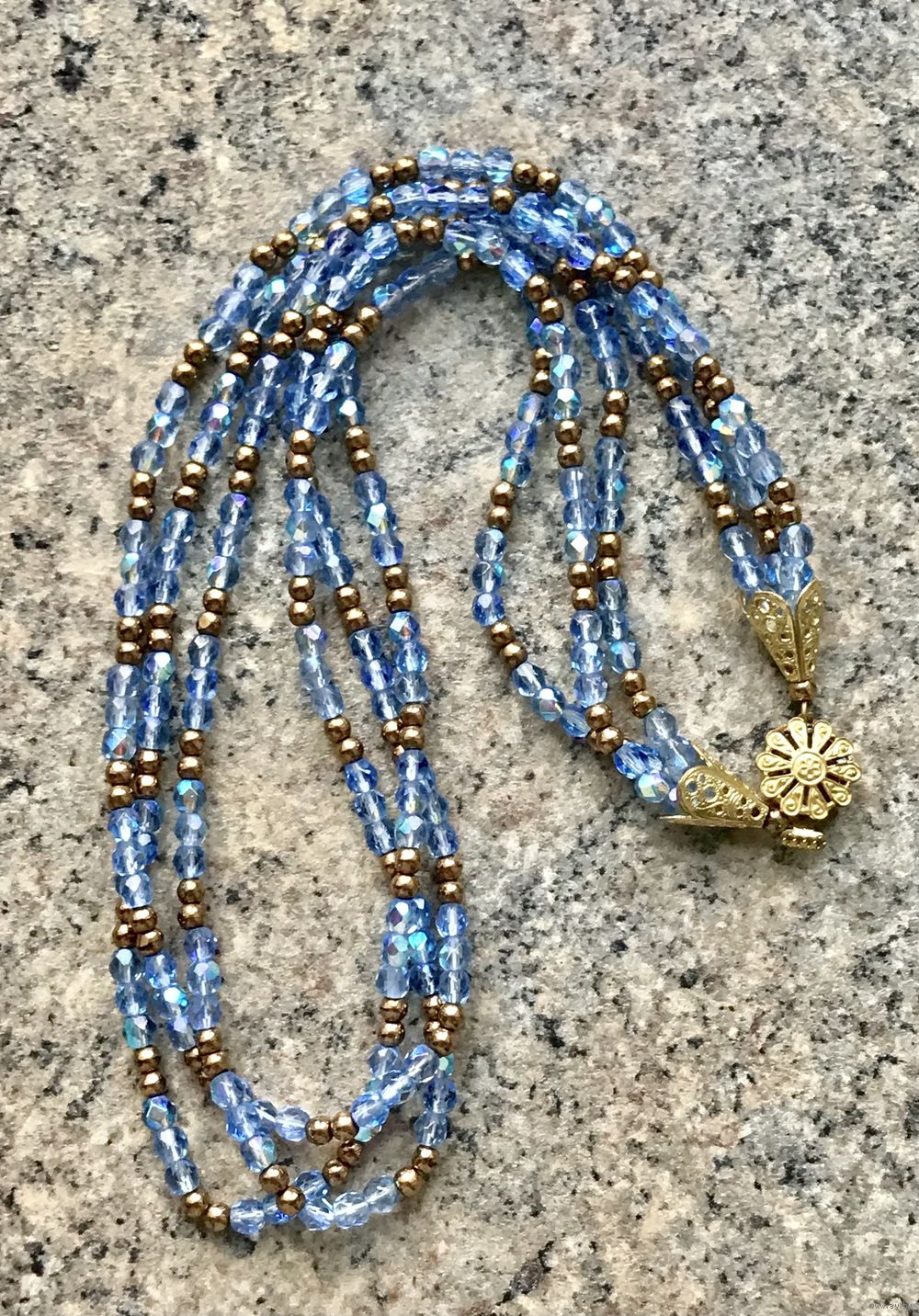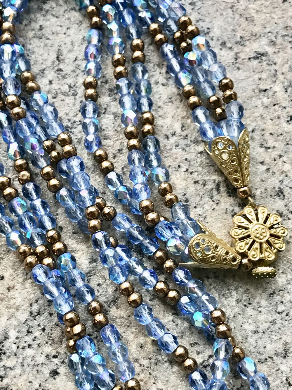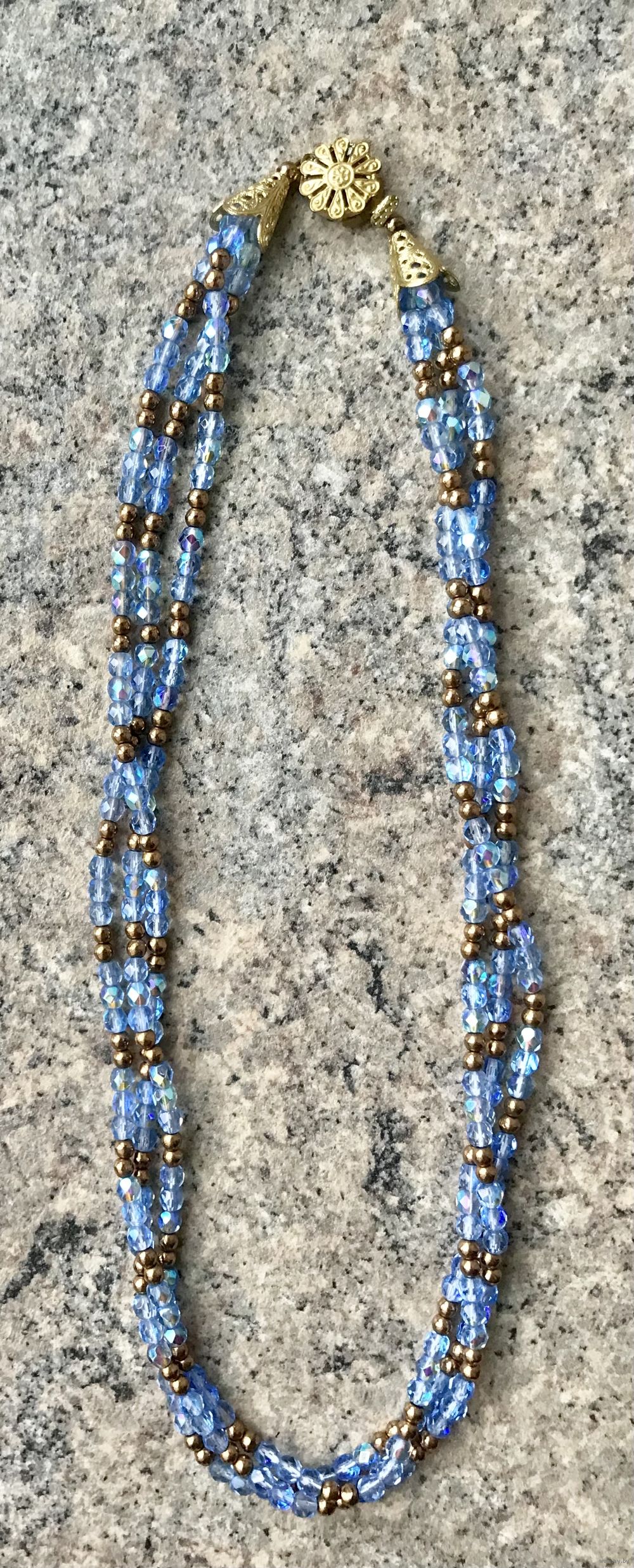 Винтажные чешские трёхрядные бусы из стекла голубого цвета с покрытием AB. Длина 52см.+1,5см.замочек. Состояние хорошее.
