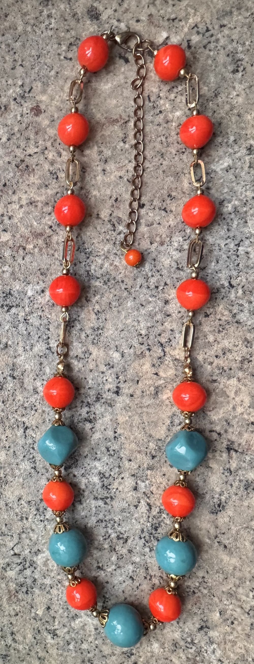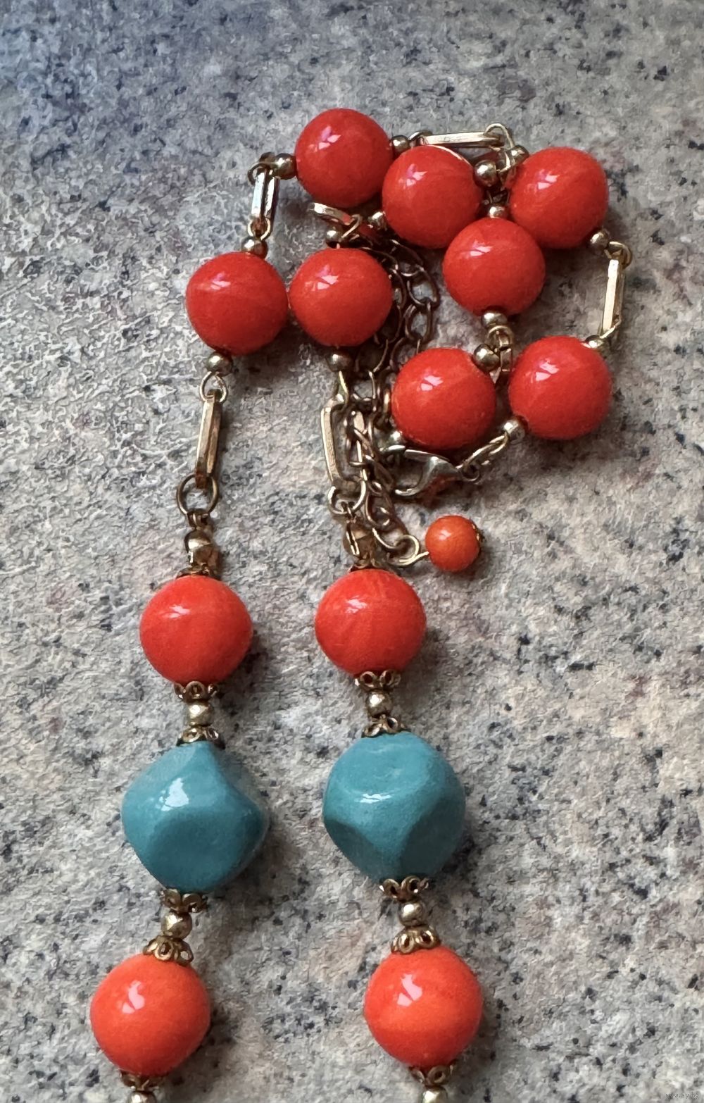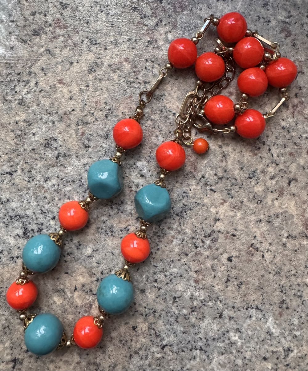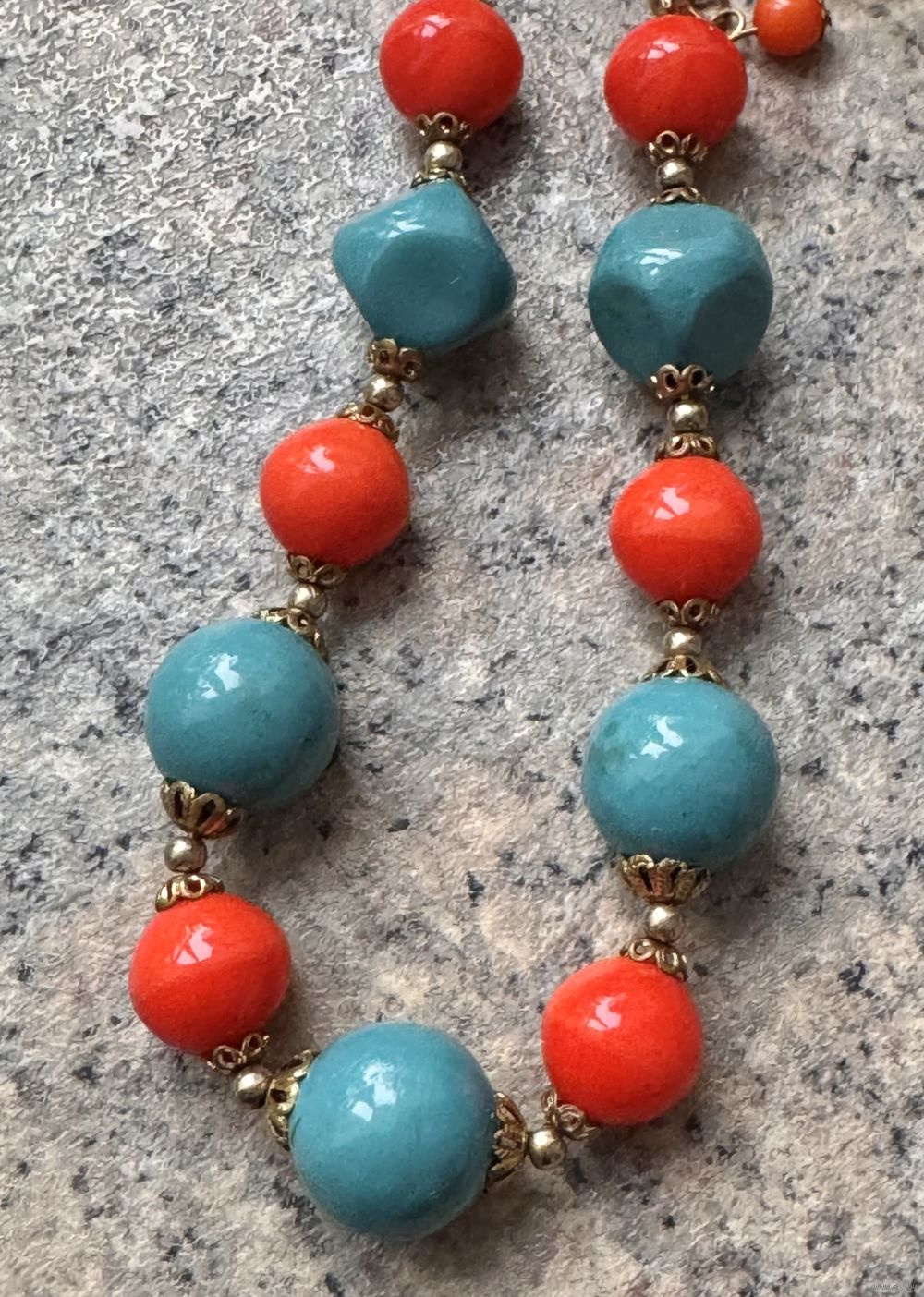 Винтажные бусы из стекла красного цвета , пластика бирюзового цвета и металла золотого тона. Длина 46см.+8см. доп.цепочка. Состояние хорошее.