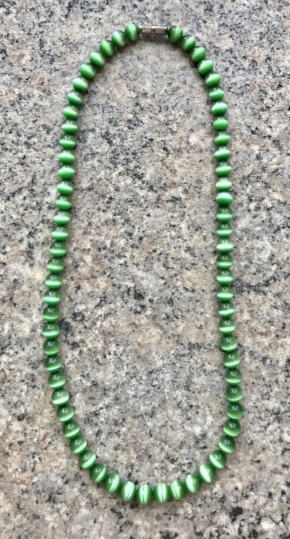 Винтажные бусы из стеклянных бусин с эффектом иризации, имитация кошачьего глаза. Длина нитки 40см., диаметр бусины 0,5см. Состояние хорошее.
