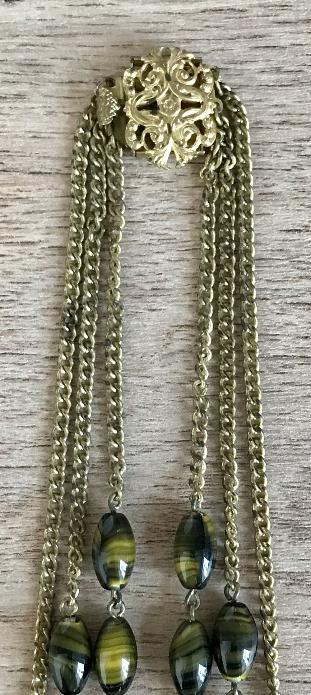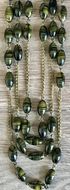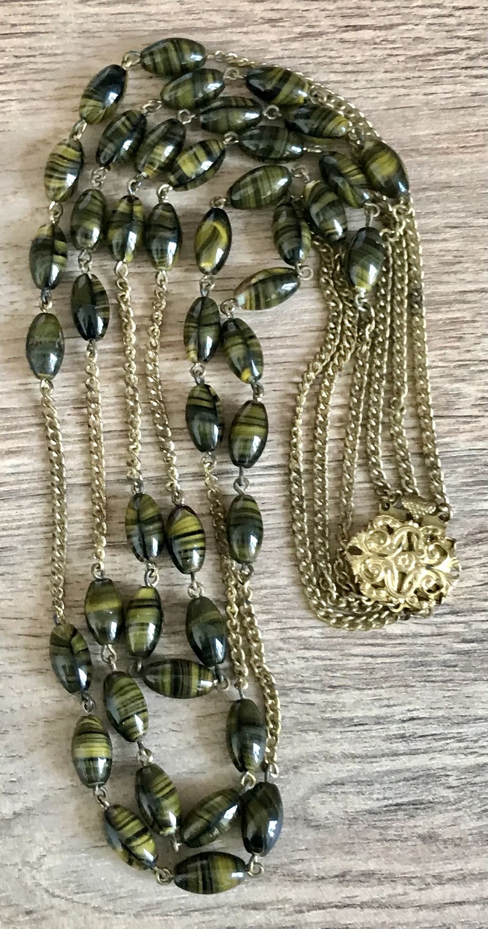 Винтажные трёхрядные бусы из худ.стекла и цепочек. Длина верхнего ряда 47см., нижнего 55см. На цепочках местами есть незначительные потёртости позоры и потемнения. Общее состояние хорошее.