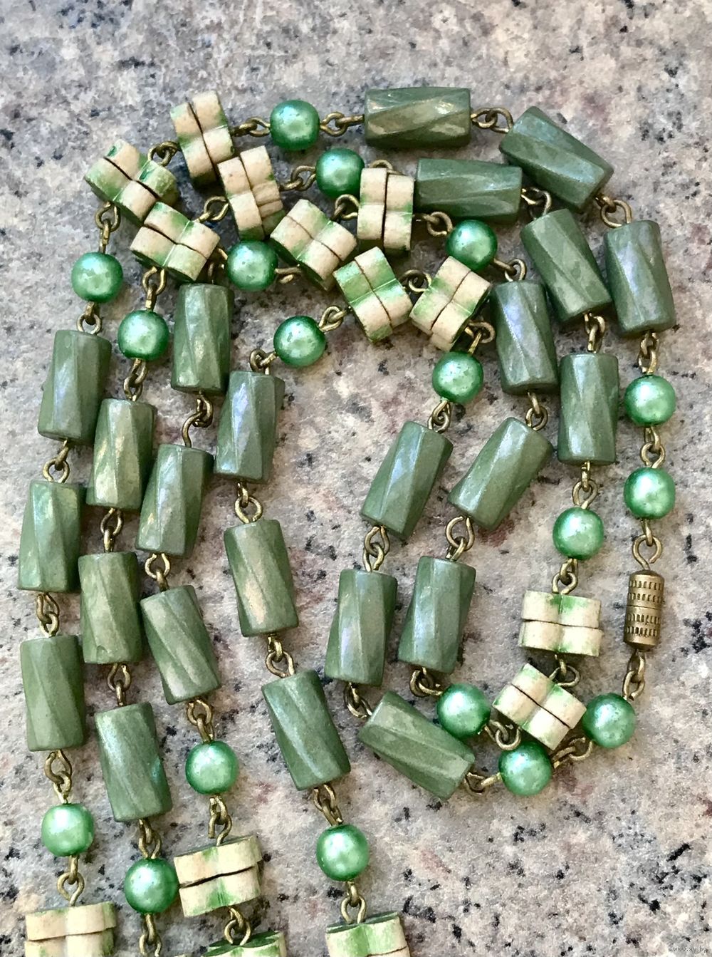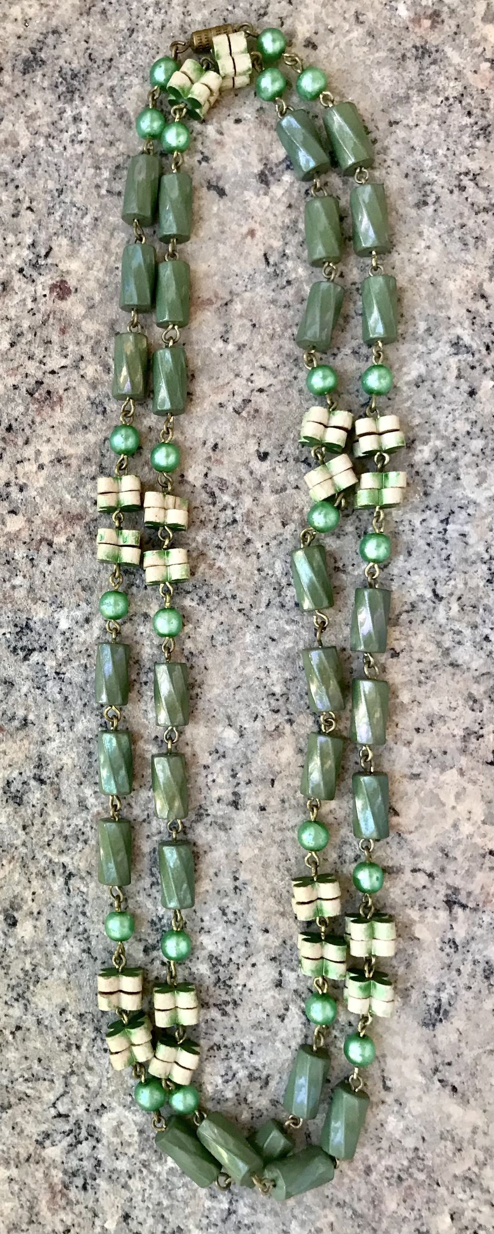 Винтажные бусы из стекла и фигурных элементов из керамики, на круглых бусинах имеется незначительный сход покрытия. Длина 96см.