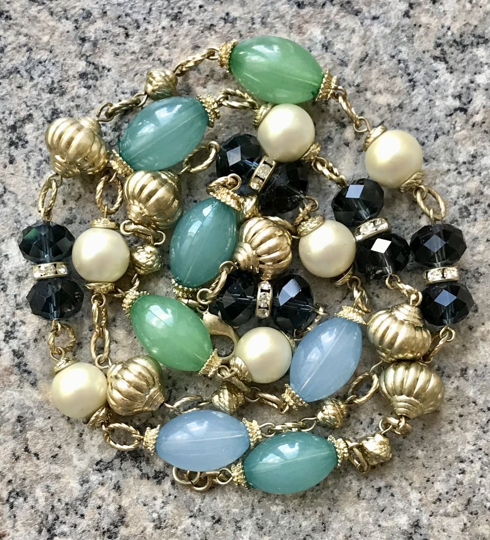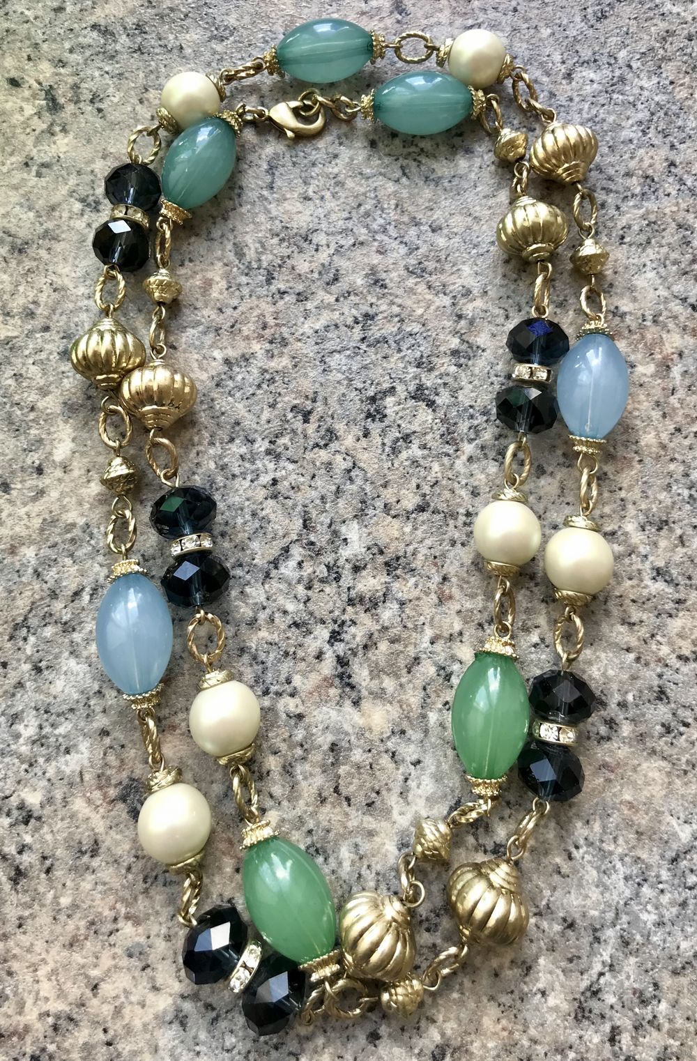 Эффектные бусы из стекла, пластика и металла золотого тона. Американский винтаж. Длина 86 см. Состояние хорошее.