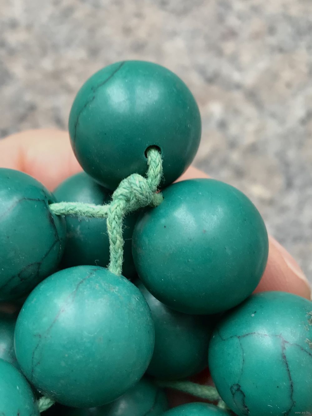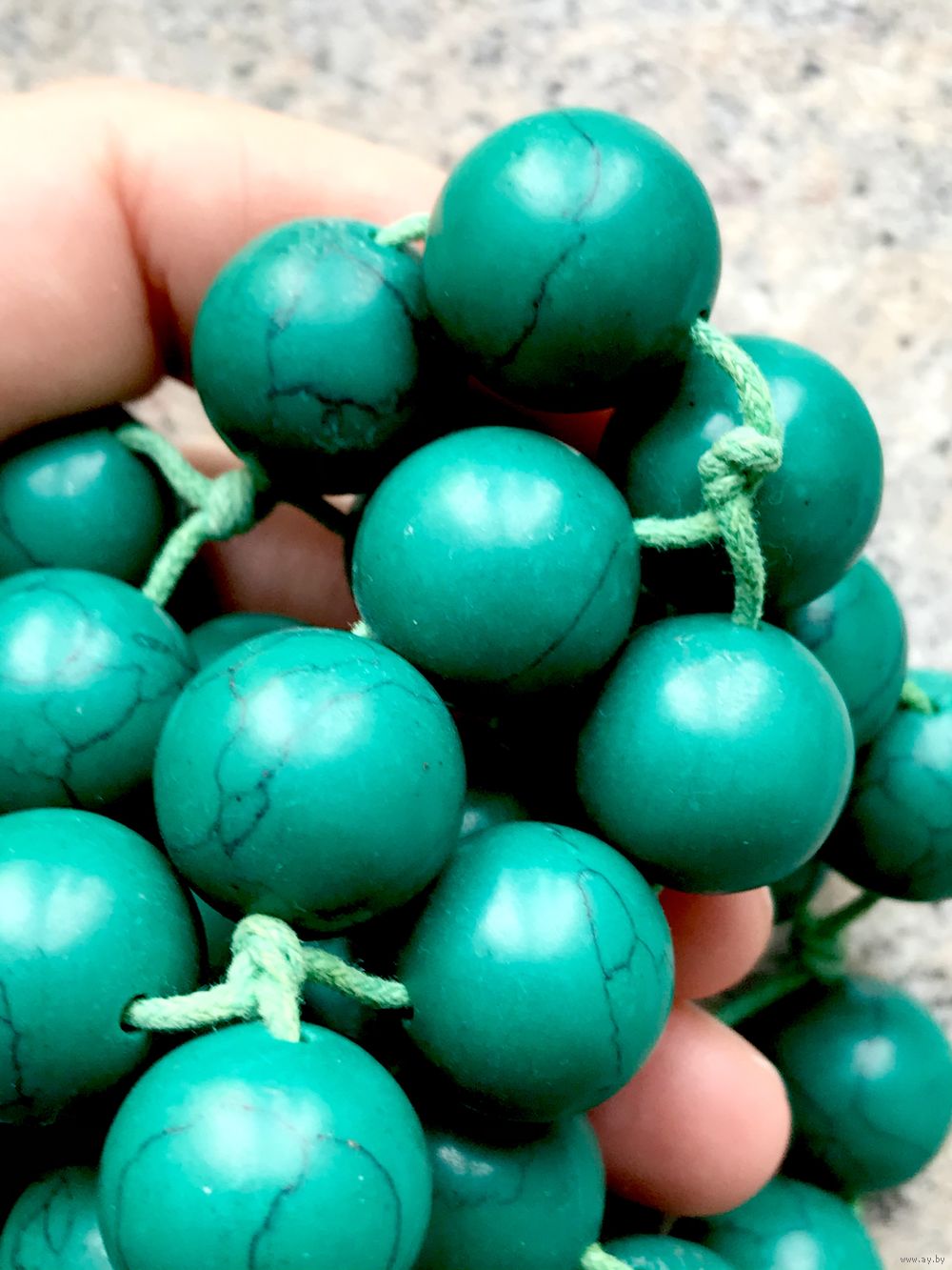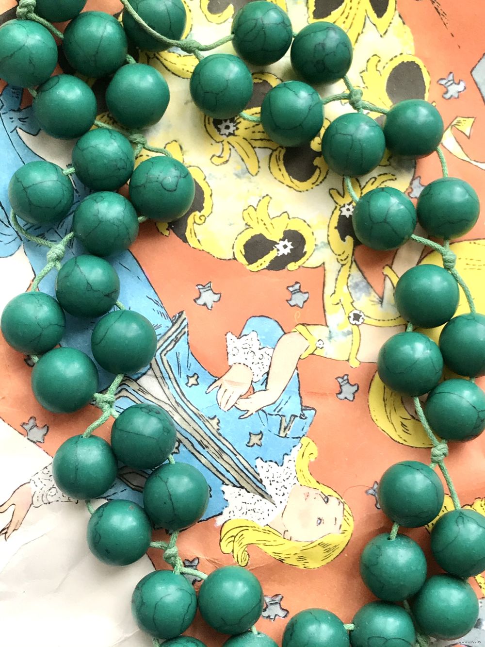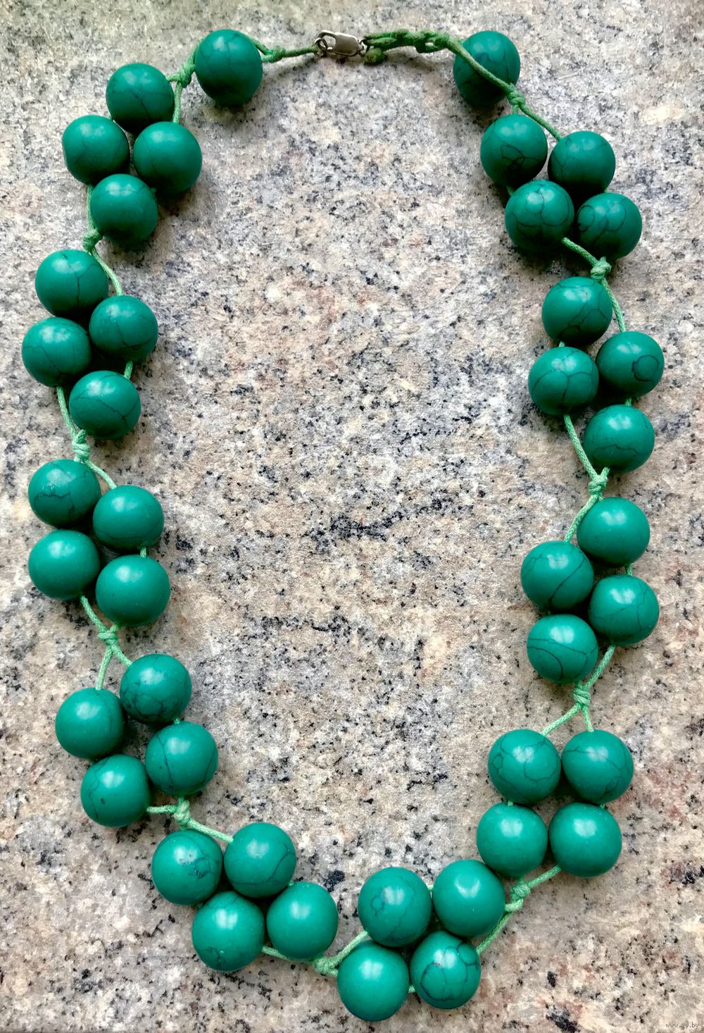 Крупные, тяжёлые бусы скорее всего из окрашенного под зелёную бирюзу говлита. Длина 55см., диаметр бусины 1,5см. Состояние хорошее.