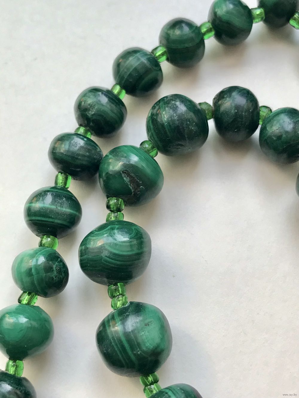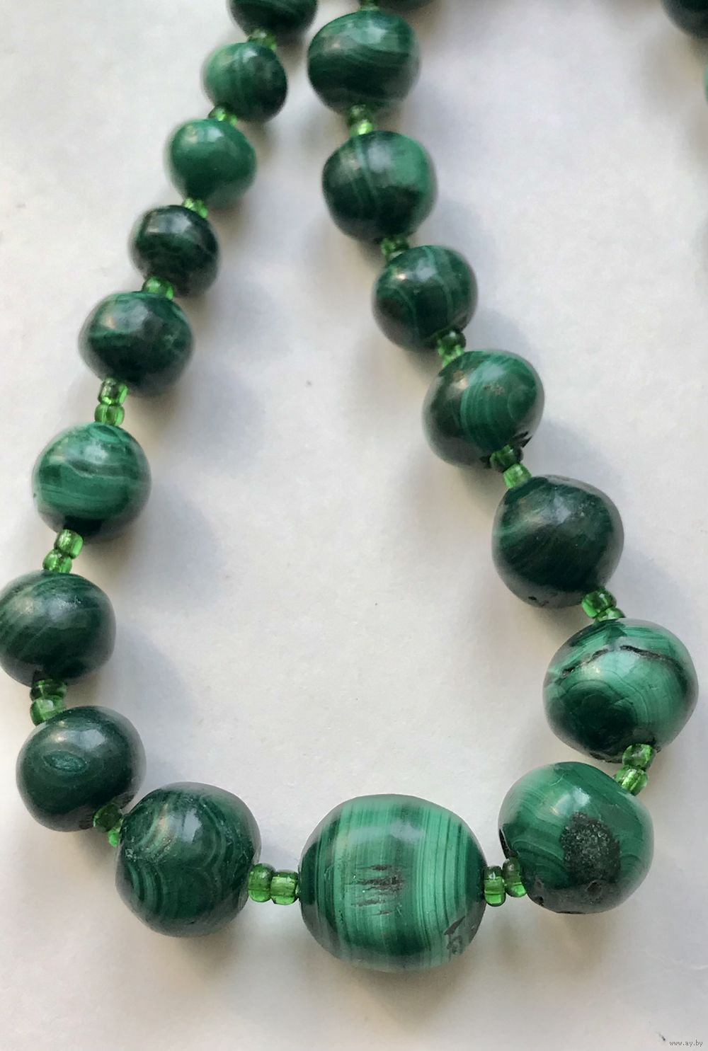 Бусы из малахита периода СССР. Размер бусин от 0,3х0,5см. до 1,6х1,4см. Длина 48см. На бусинах имеются неровности и шероховатости естественного происхождения.