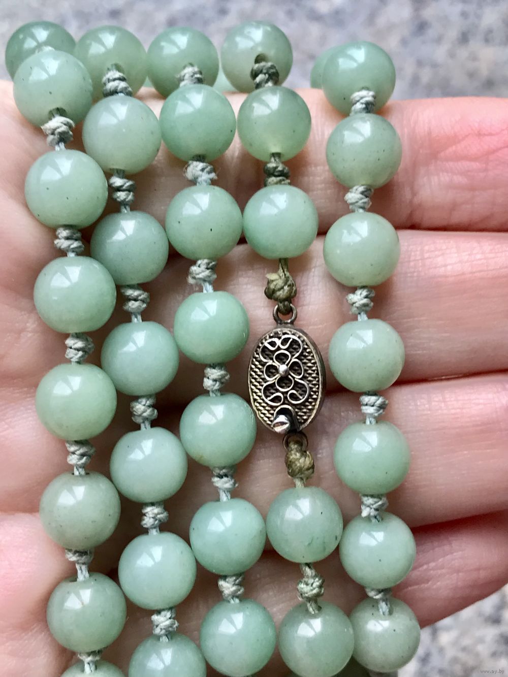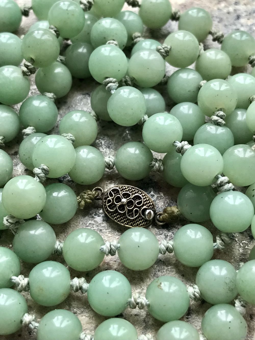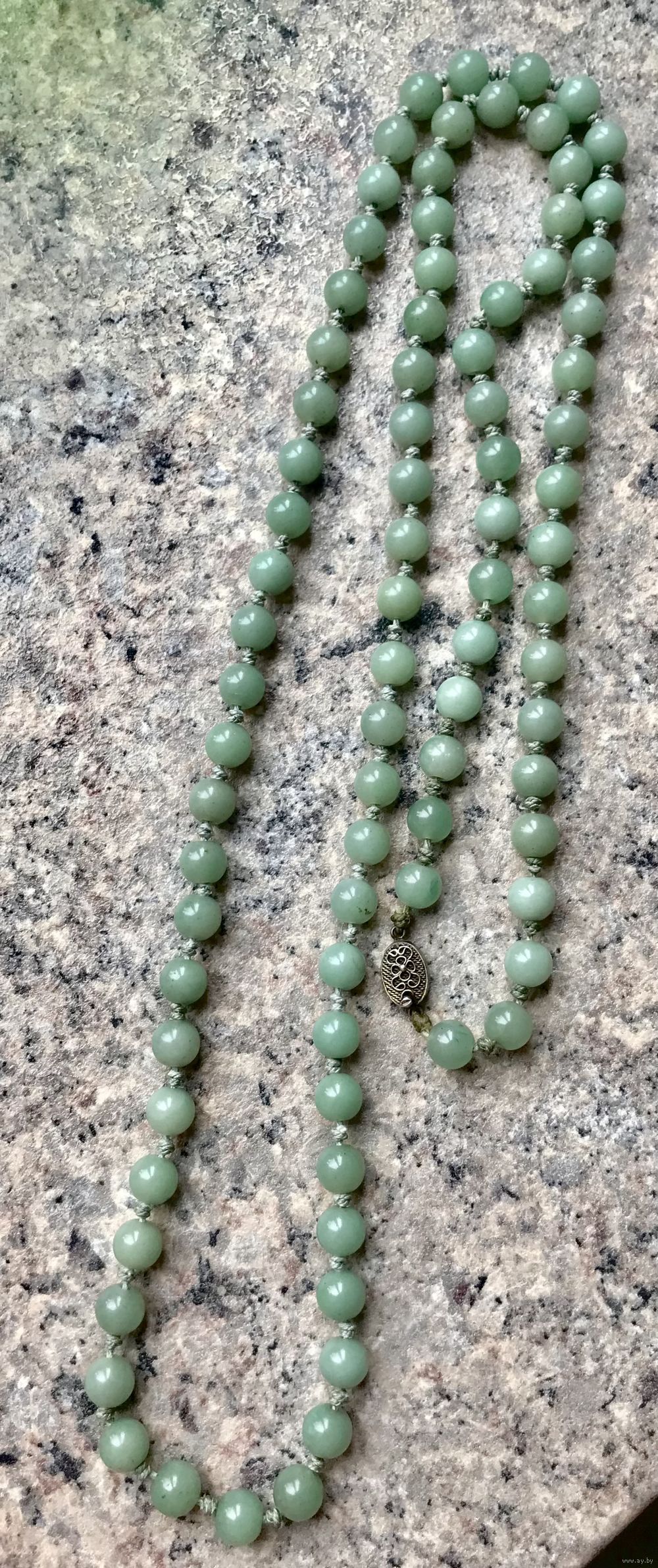 Антикварные (первая пол.ХХв.) бусы из натурального камня (нефрит? зелёный авантюрин?). Экспортный Китай. Длина бус 94см., замочек из серебра (стоит маркировка Silver) длиной 1см., диаметр бусин ~0,7-0,8см. Состояние хорошее.