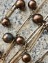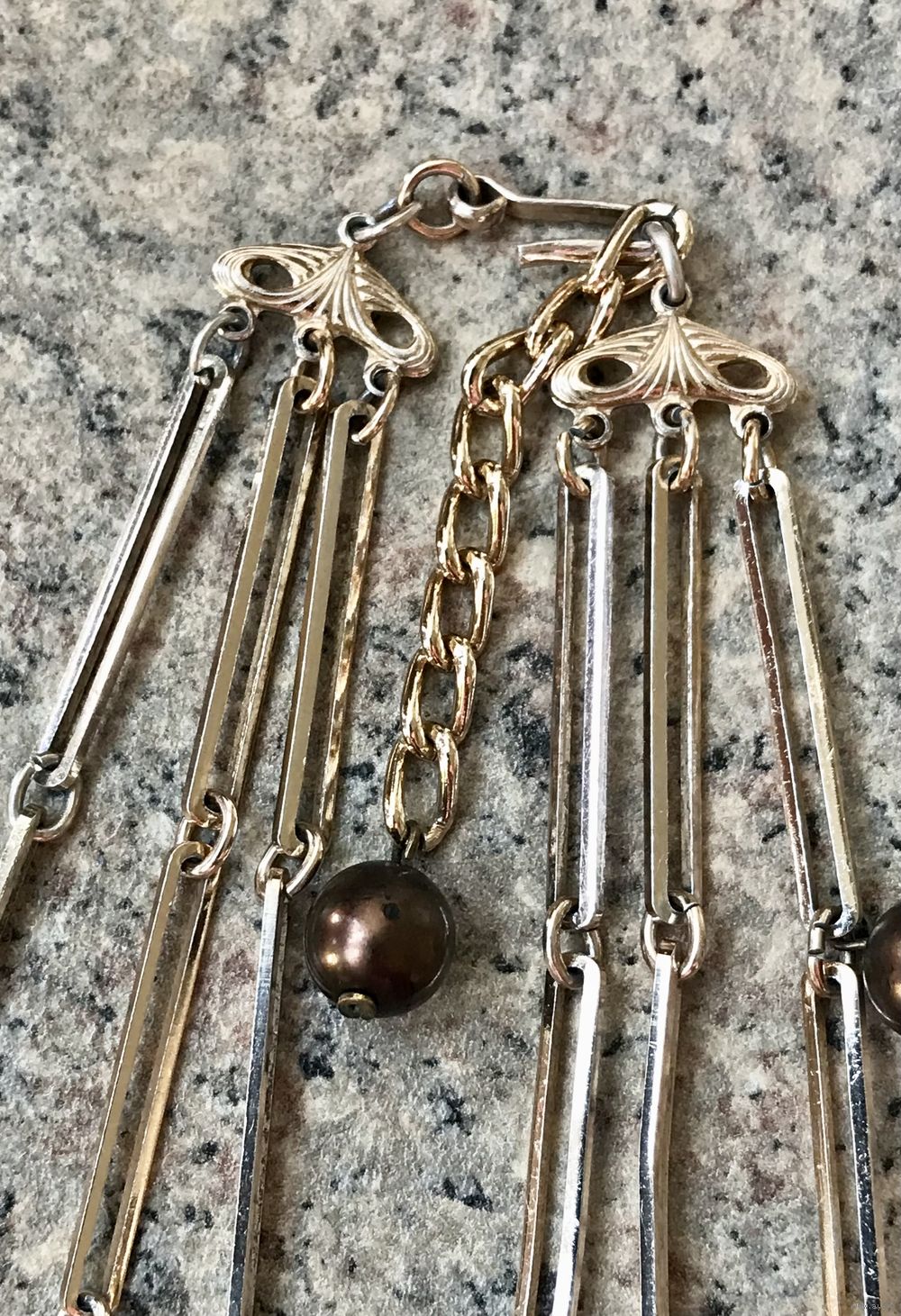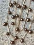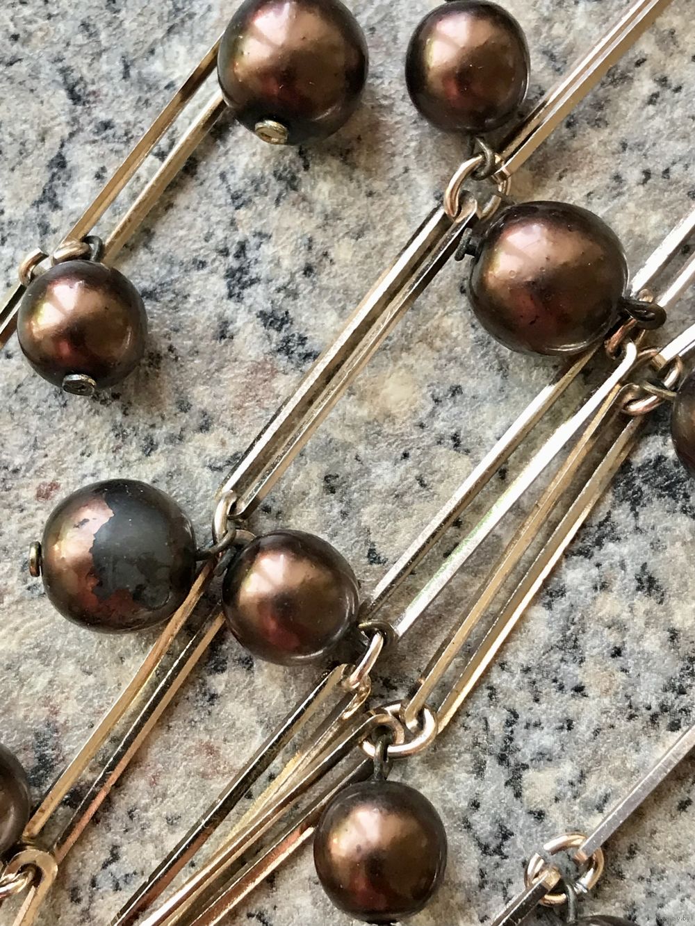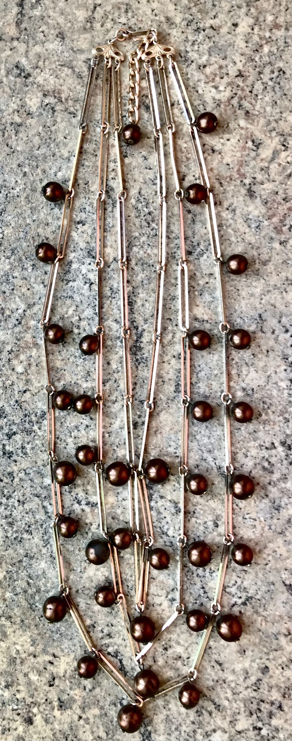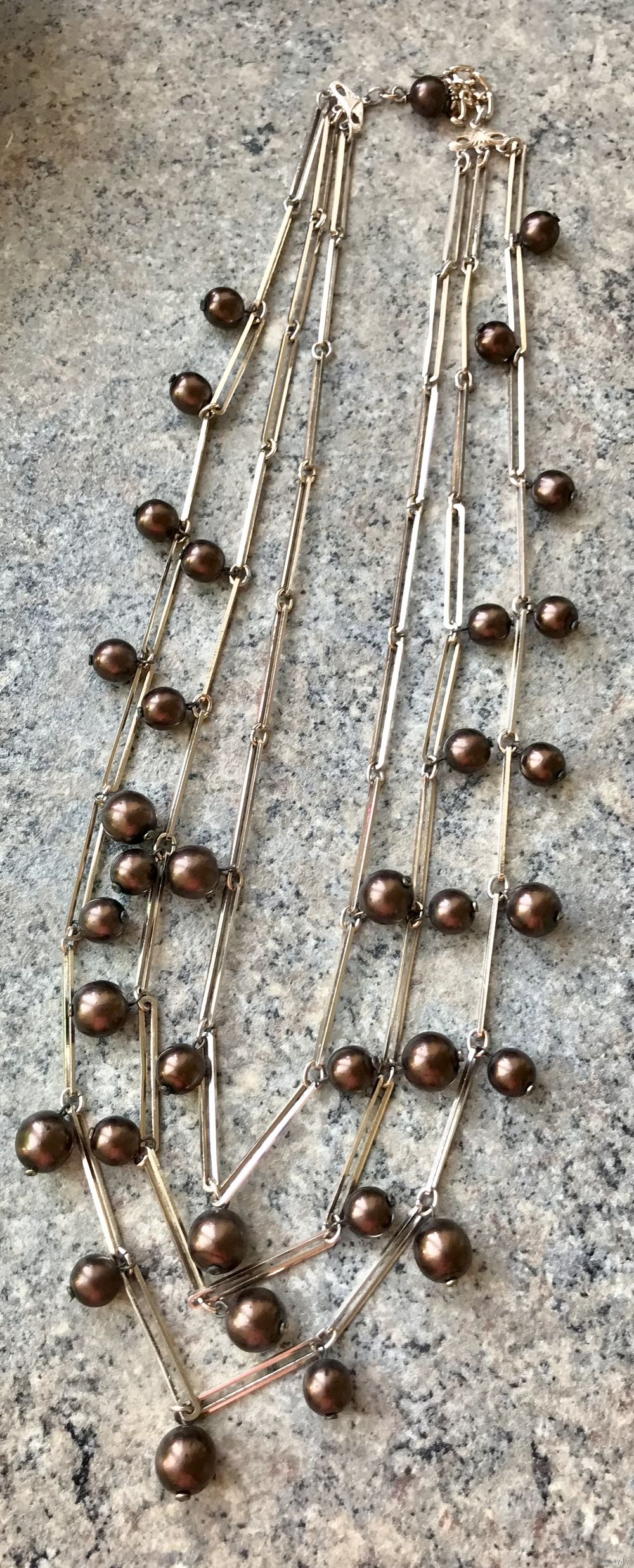 Эффектное трёхрядкой колье из металла золотистого тона (возле застёжки есть незначительные потёртости позолоты) и стеклянных бусин с покрытием шоколадного цвета (есть несколько бусин с потертостями покрытия, в глаза не бросается). Длина верхней нити 52см., нижней 68см.+6см. доп.цепочка. Все нюансы учтены в цене.