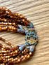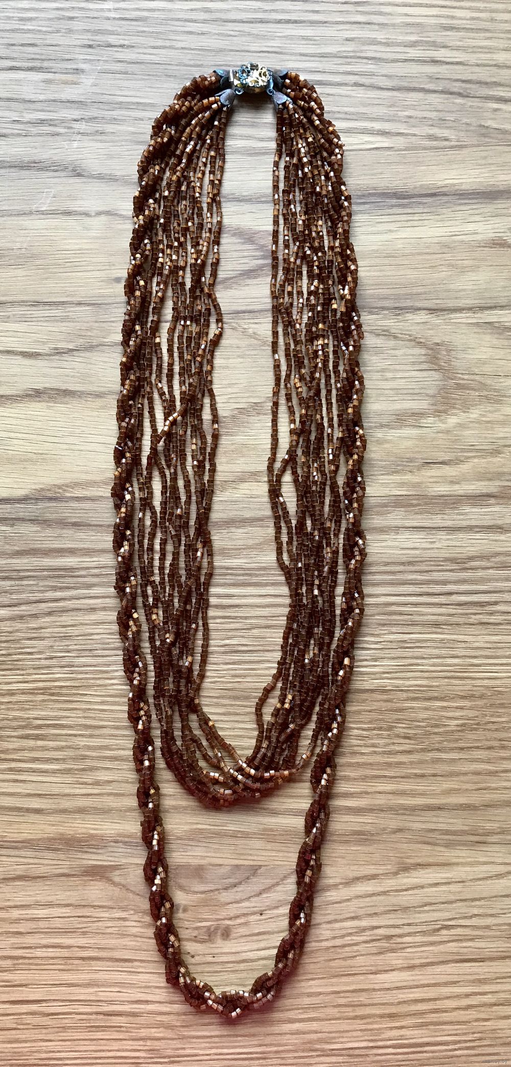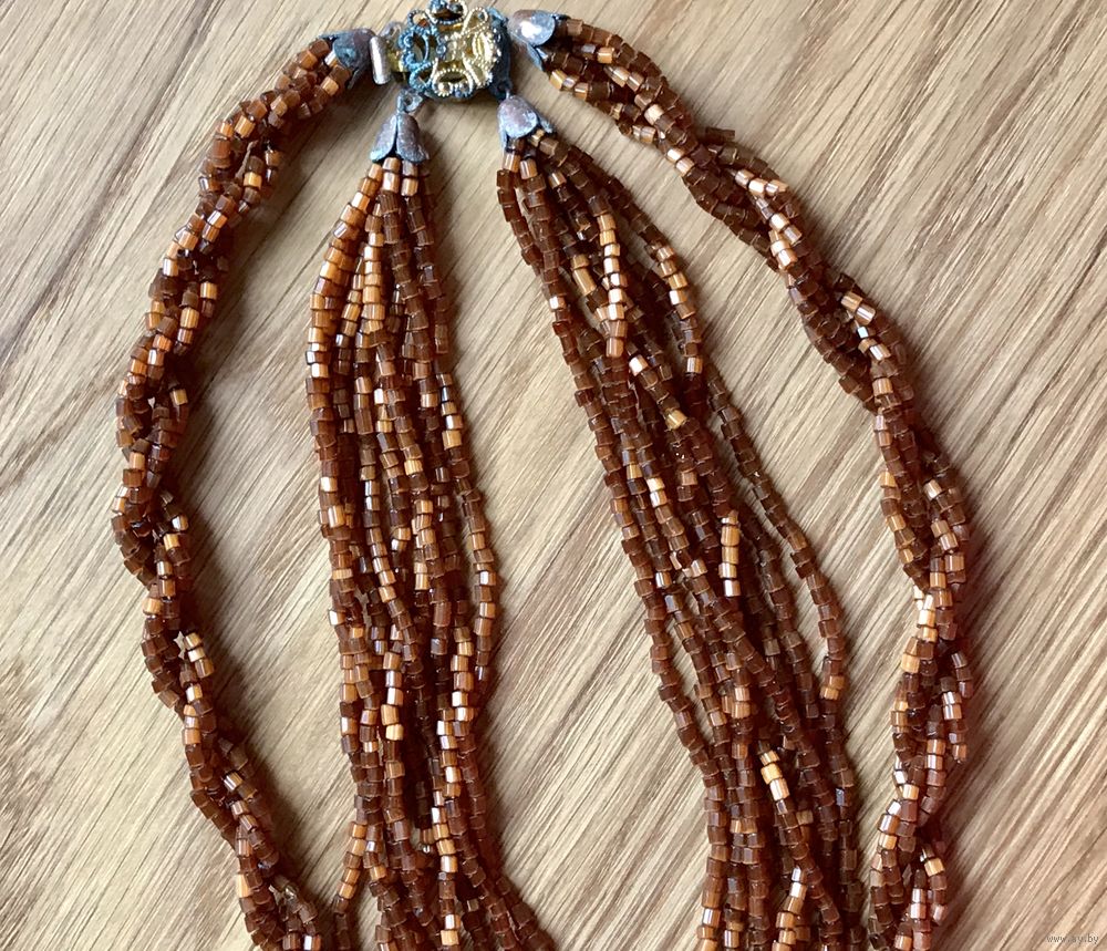Винтажные чешские бусы из сатинового бисера золотисто-коричневого цвета. Застежка оригинальная из латуни работает исправно, на лицевой и обратной сторонах частично имеются следы окиси (учтено в цене). Длина в сложенном виде по верхней нити 30см., по нижней 40см.