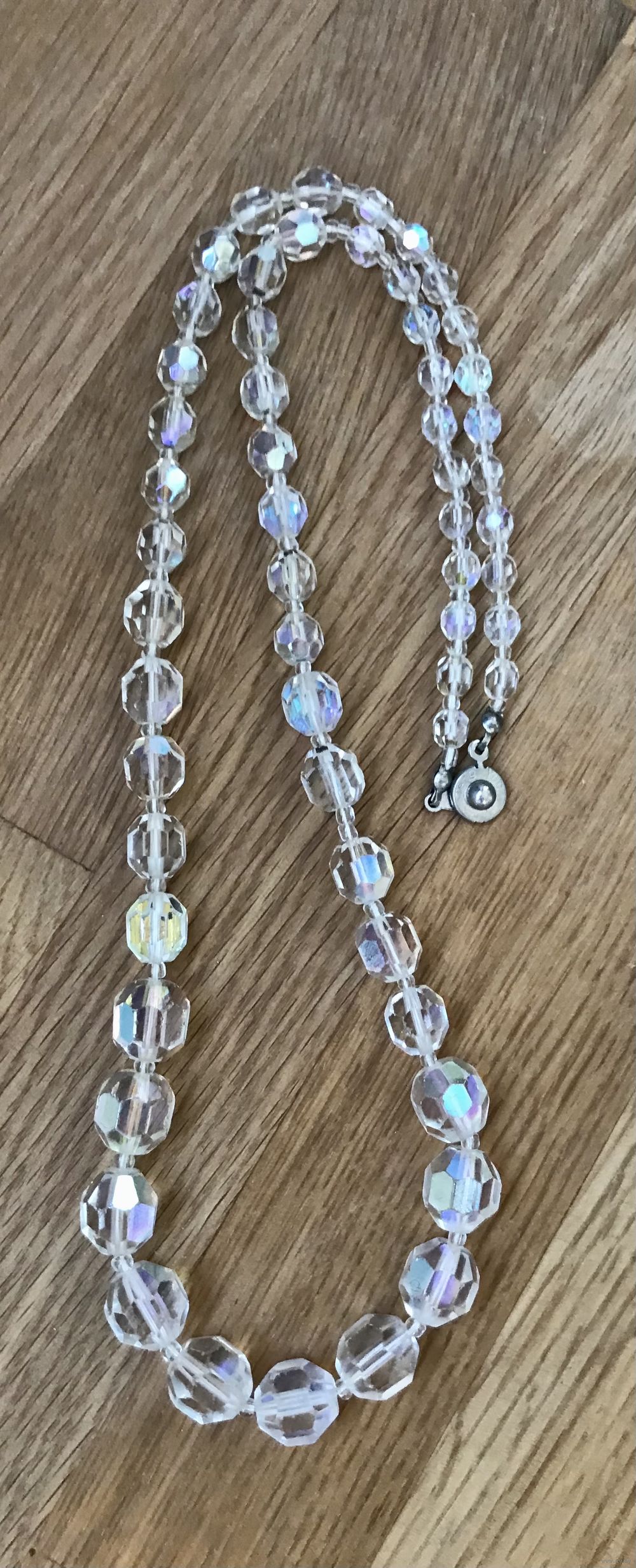 Винтажные бусы из стекла с покрытием AB. Размер бусин от 0,5х0,6см. до 1,1х1,2см. Длина 65 см. На гранях нескольких бусин есть незначительные скольчики. Была произведена замена замка. Общее состояние украшения хорошее.