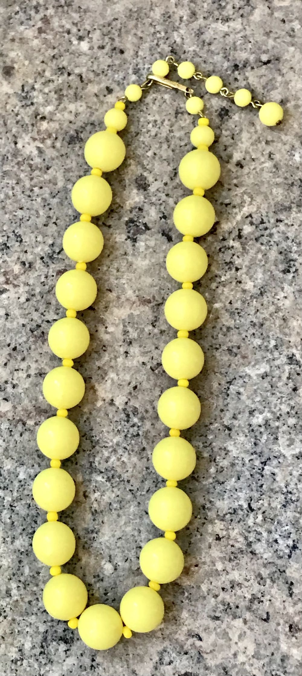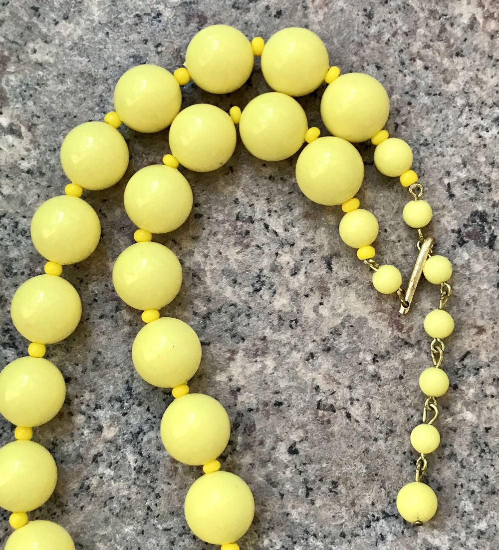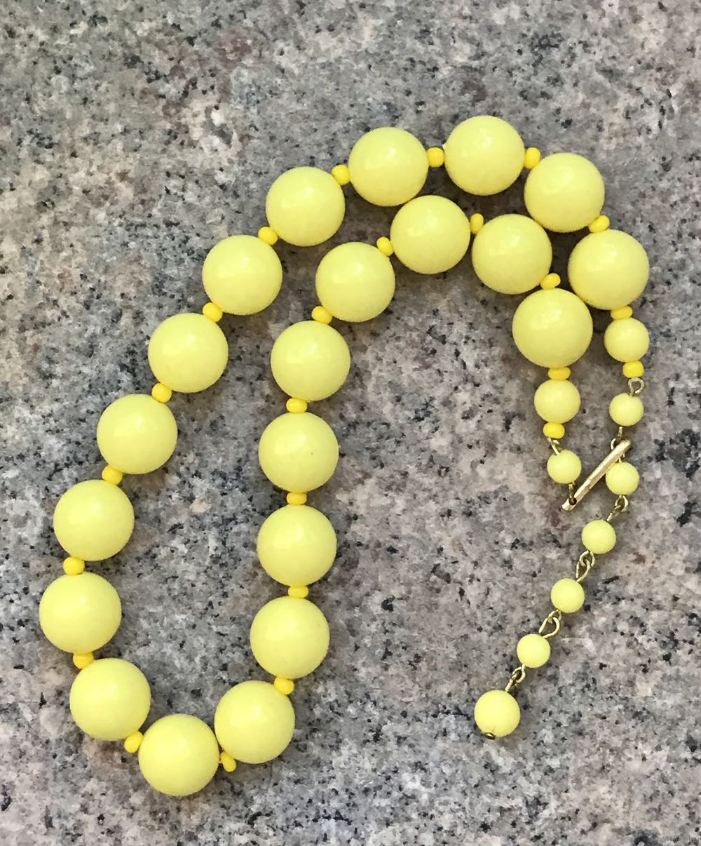 Винтажные бусы из пластика ярко-желтого цвета. Максимальная длина 44см. Диаметр бусин 1,3см. Состояние хорошее.