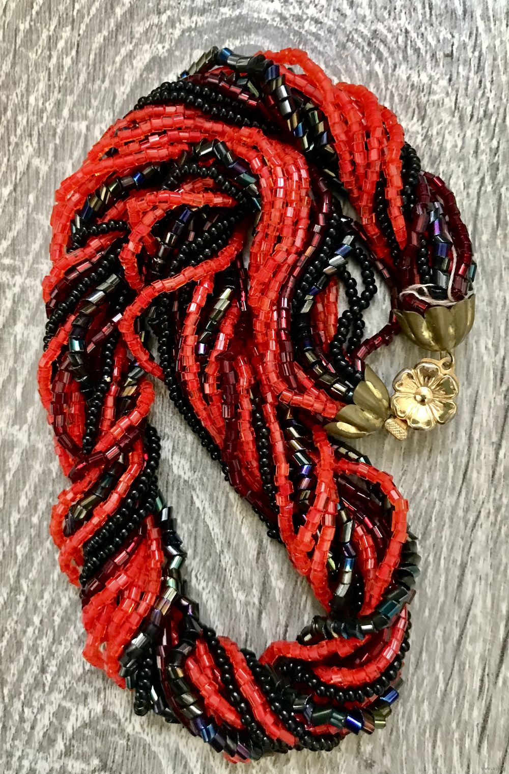 Винтажные бусы из 16-ти ниток с разного вида бисером. На латунных шапочках стерлась позолота. Длина 42см.