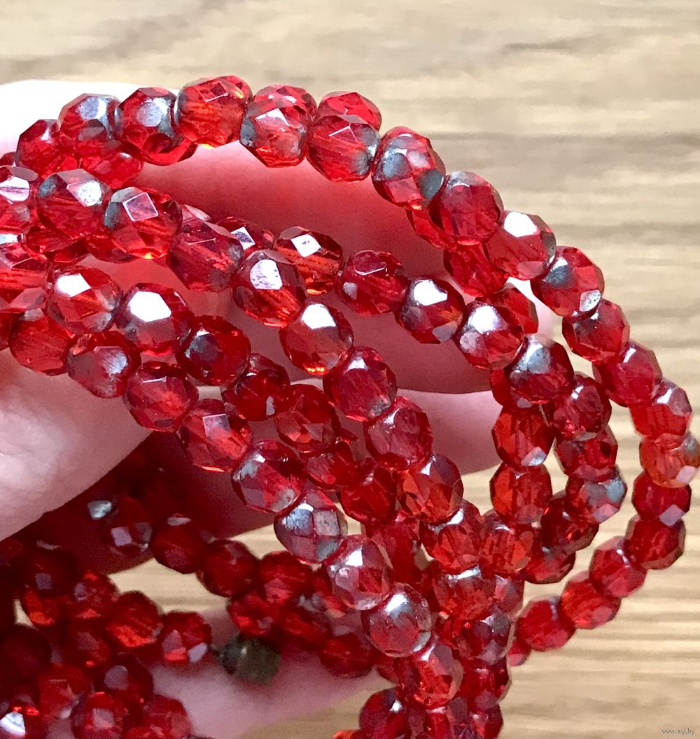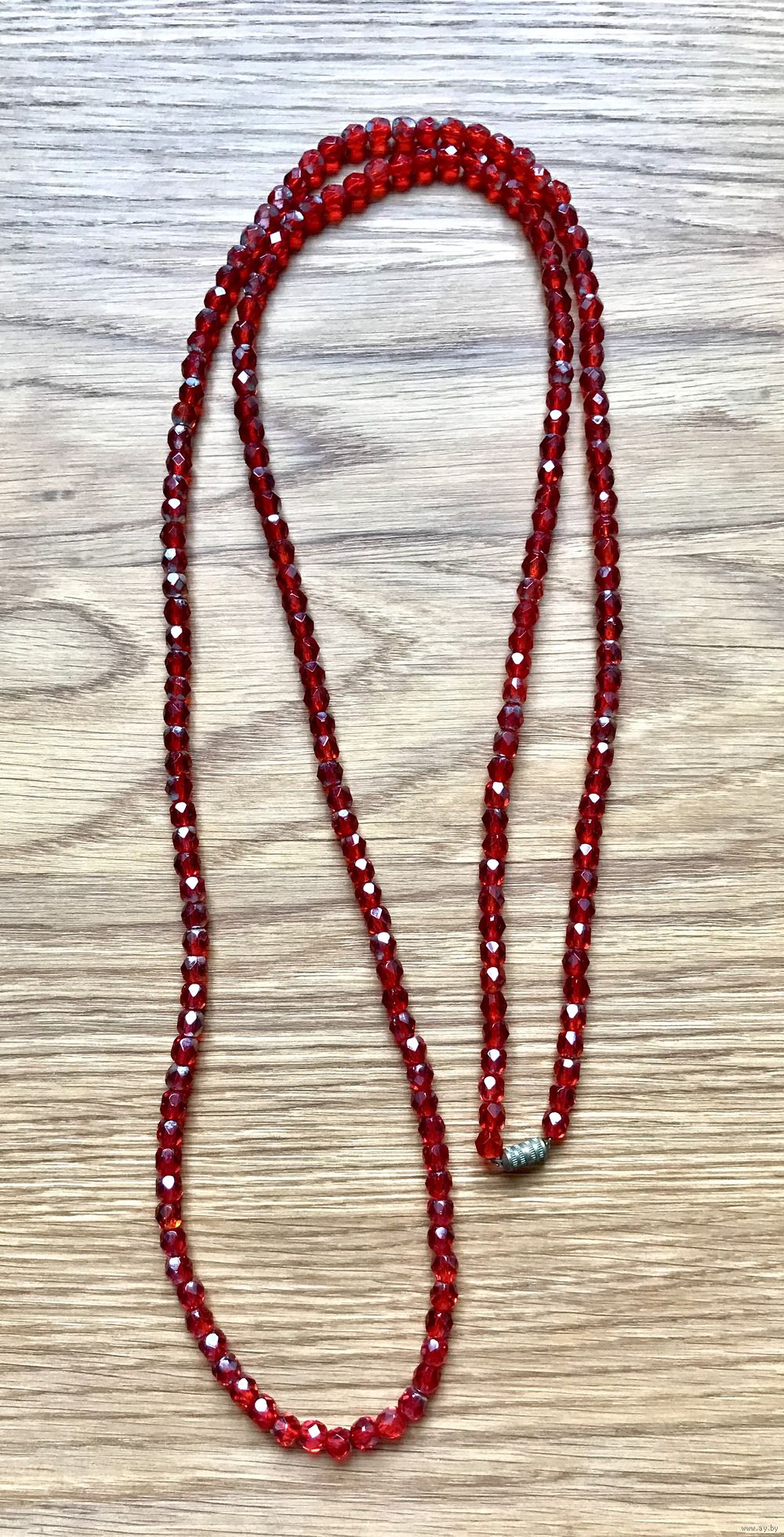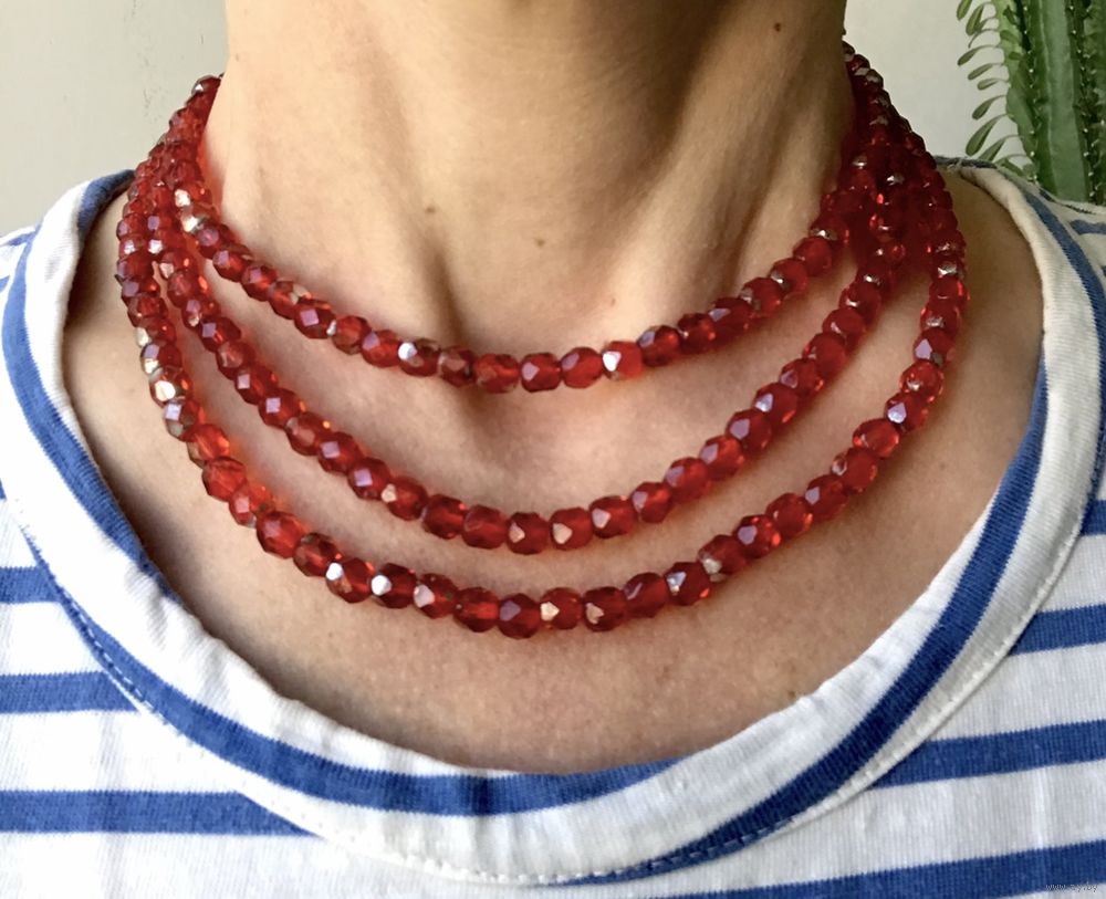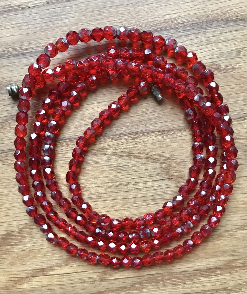 Винтажные чешские бусы из рубинового стекла с остатками покрытия AB. Длина 120см., размер бусин~ 0,6х0,5см. Нанизаны на леску.