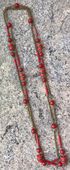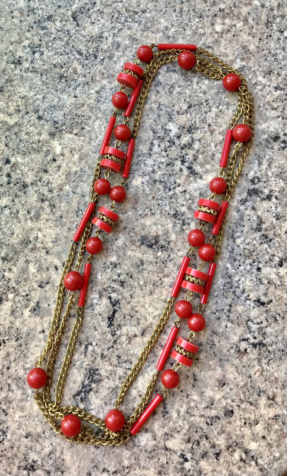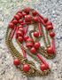 Винтажные чешские бусы, состоящие из цепочки (латунь с позолотой, местами незначительные потёртости) и бусин из плотного пластика насыщенного красного цвета. Неразъемные. Длина 136см.