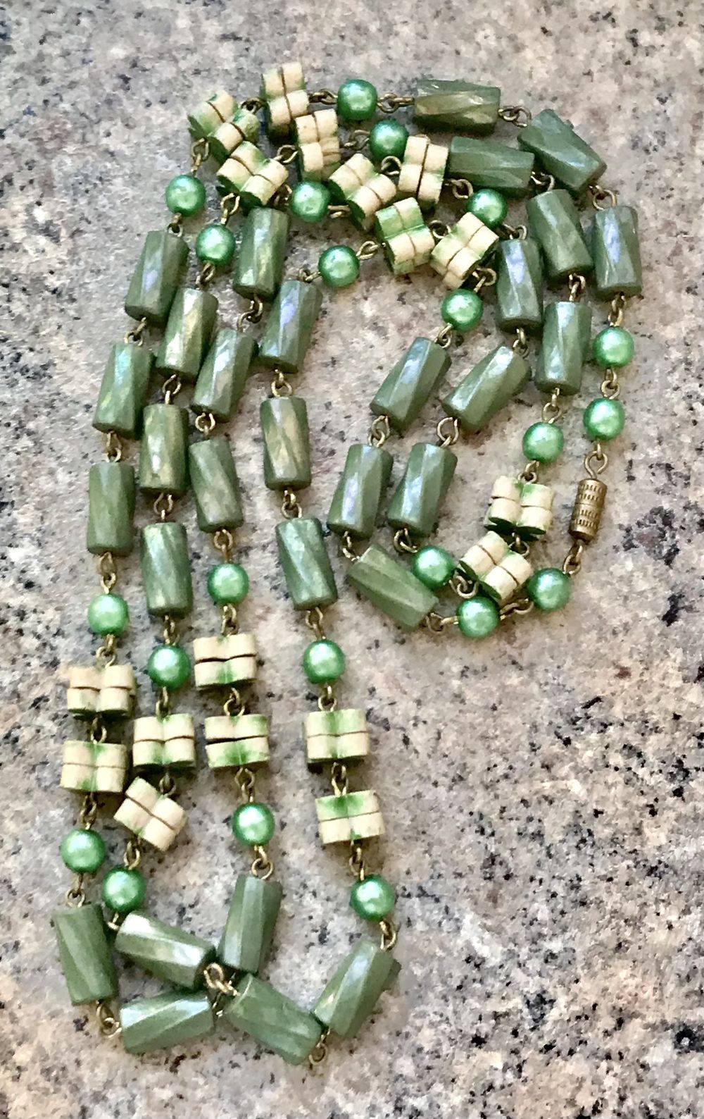 Винтажные бусы из стекла и фигурных элементов из керамики, на круглых бусинах имеется незначительный сход покрытия. Длина 96см.