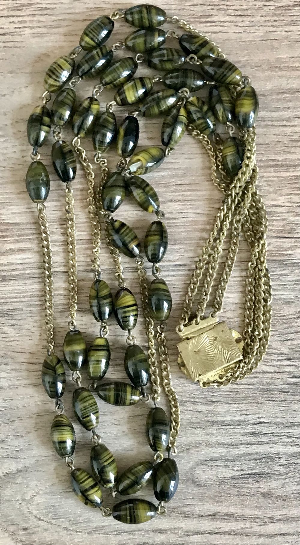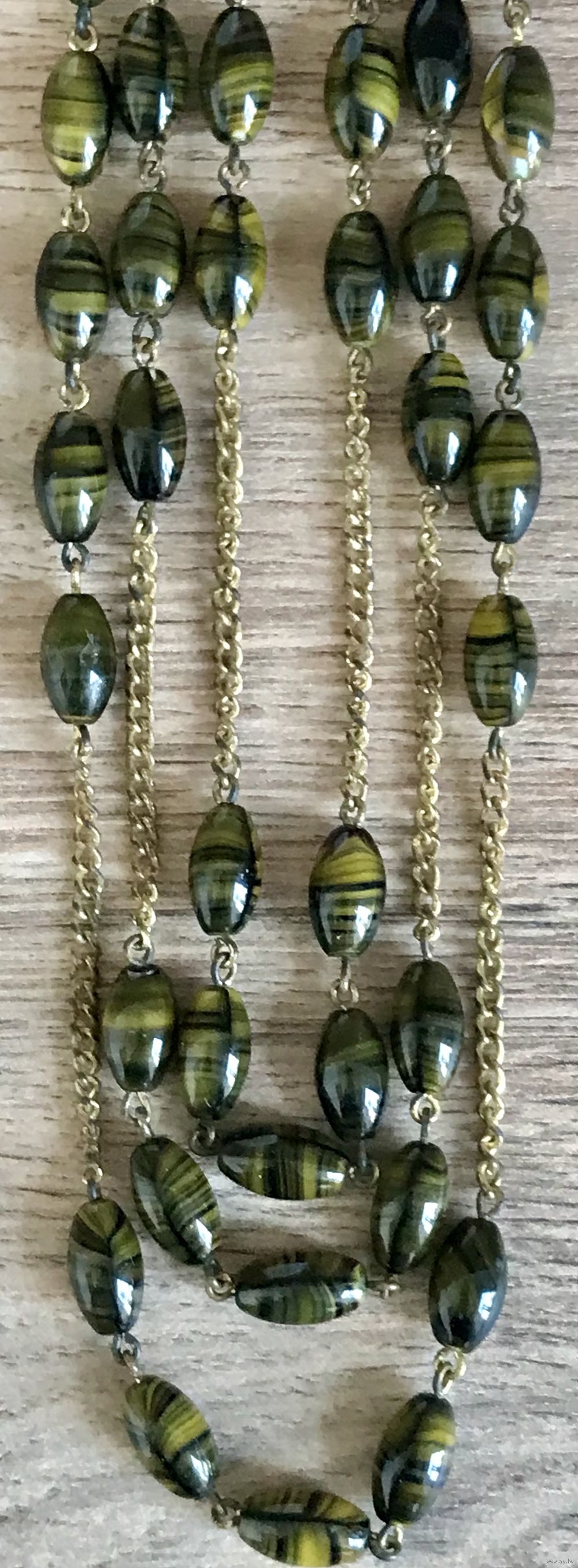 Винтажные трёхрядные бусы из худ.стекла и цепочек. Длина верхнего ряда 47см., нижнего 55см. На цепочках местами есть незначительные потёртости позоры и потемнения. Общее состояние хорошее.