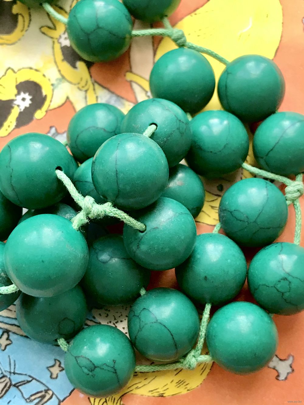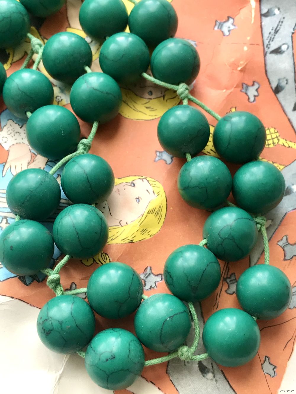 Крупные, тяжёлые бусы скорее всего из окрашенного под зелёную бирюзу говлита. Длина 55см., диаметр бусины 1,5см. Состояние хорошее.