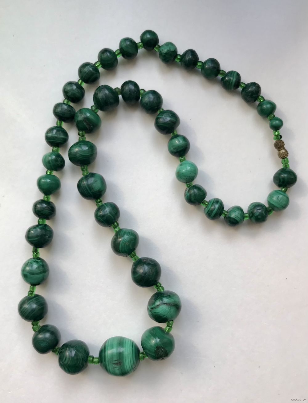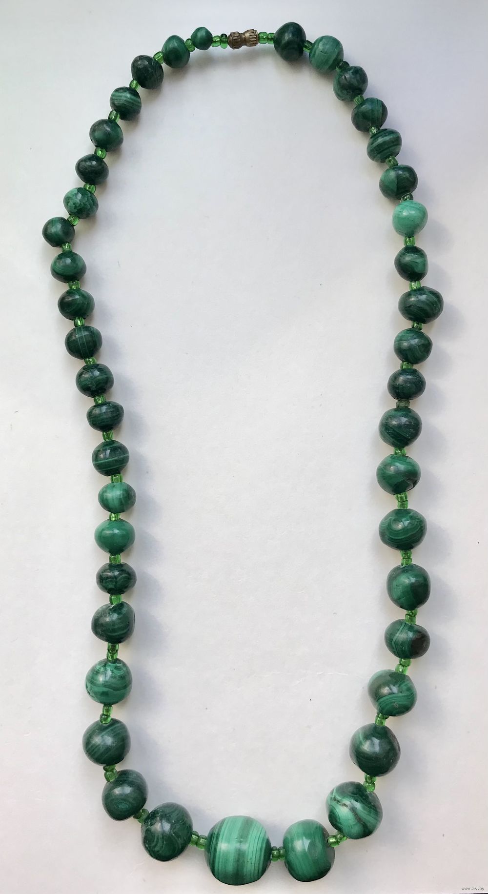 Бусы из малахита периода СССР. Размер бусин от 0,3х0,5см. до 1,6х1,4см. Длина 48см. На бусинах имеются неровности и шероховатости естественного происхождения.