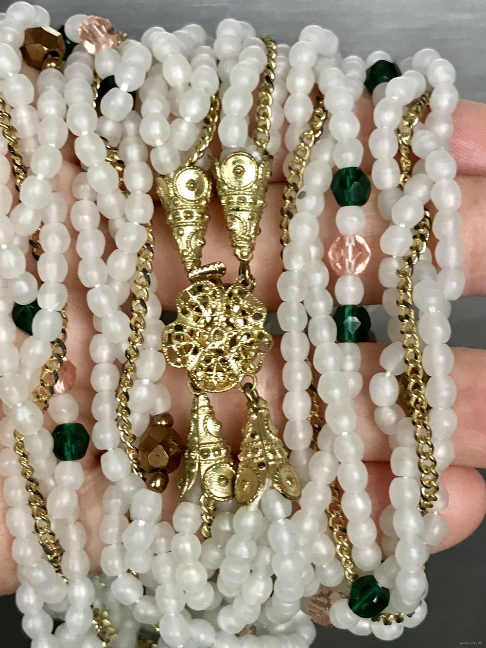 Винтажные чешские бусы. Стекло и цепи из металла золотого тона. Длина верхнего ряда 64см., нижнего 70см. Состояние хорошее.