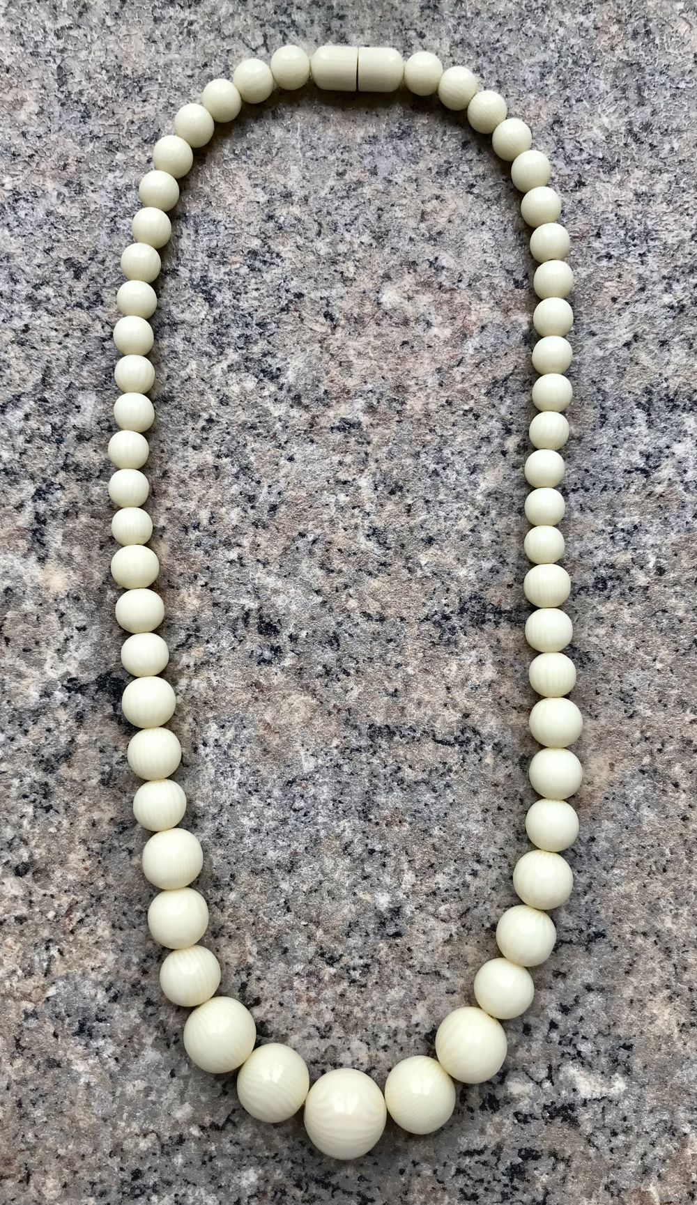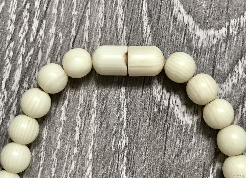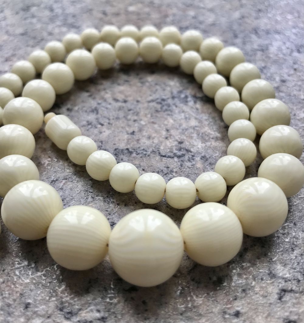 Бусы из айворина, первая половина ХХв. Длина 34см., диаметр бусин от 0,6см. до 1,4см. На застёжке имеется небольшой скол, на функционал и внешний вид не влияет, этот момент учтён в цене. Общее состояние хорошее.