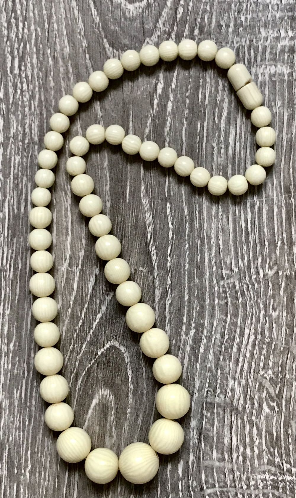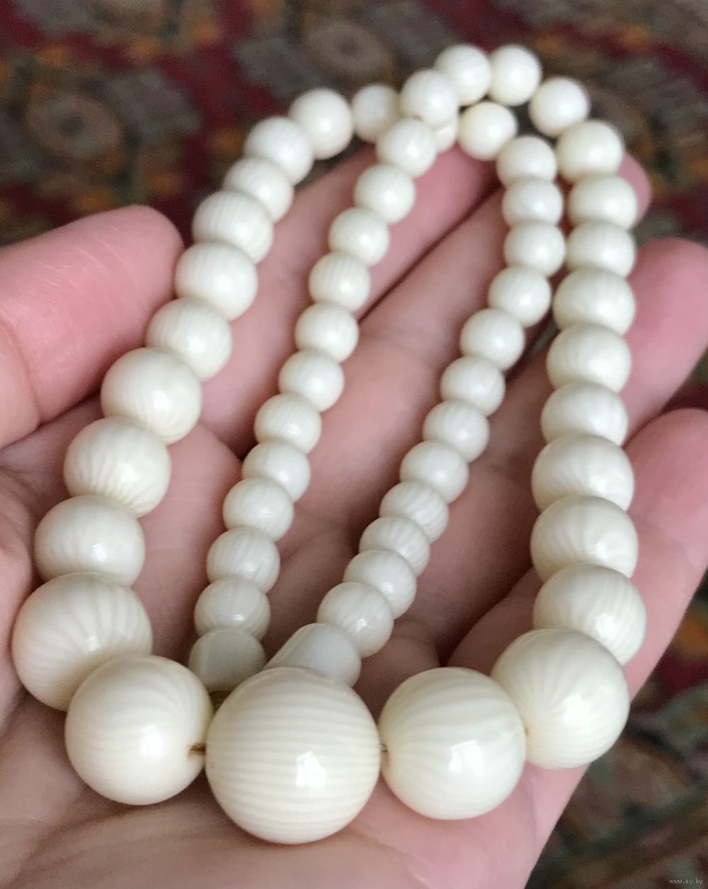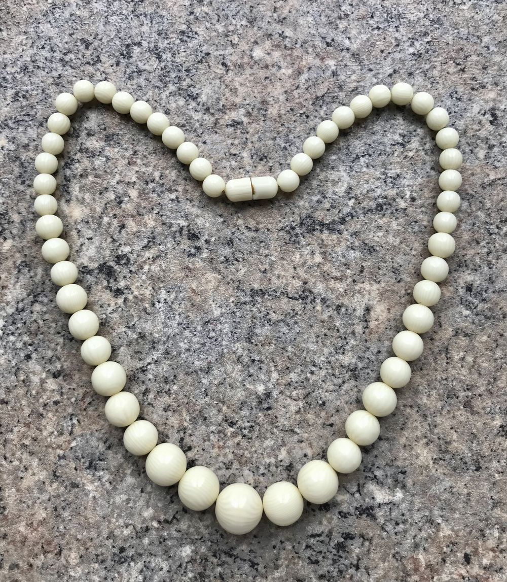 Бусы из айворина, первая половина ХХв. Длина 34см., диаметр бусин от 0,6см. до 1,4см. На застёжке имеется небольшой скол, на функционал и внешний вид не влияет, этот момент учтён в цене. Общее состояние хорошее.