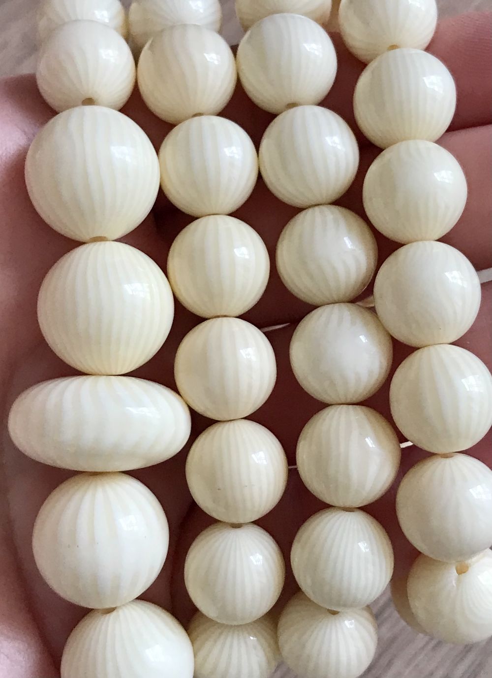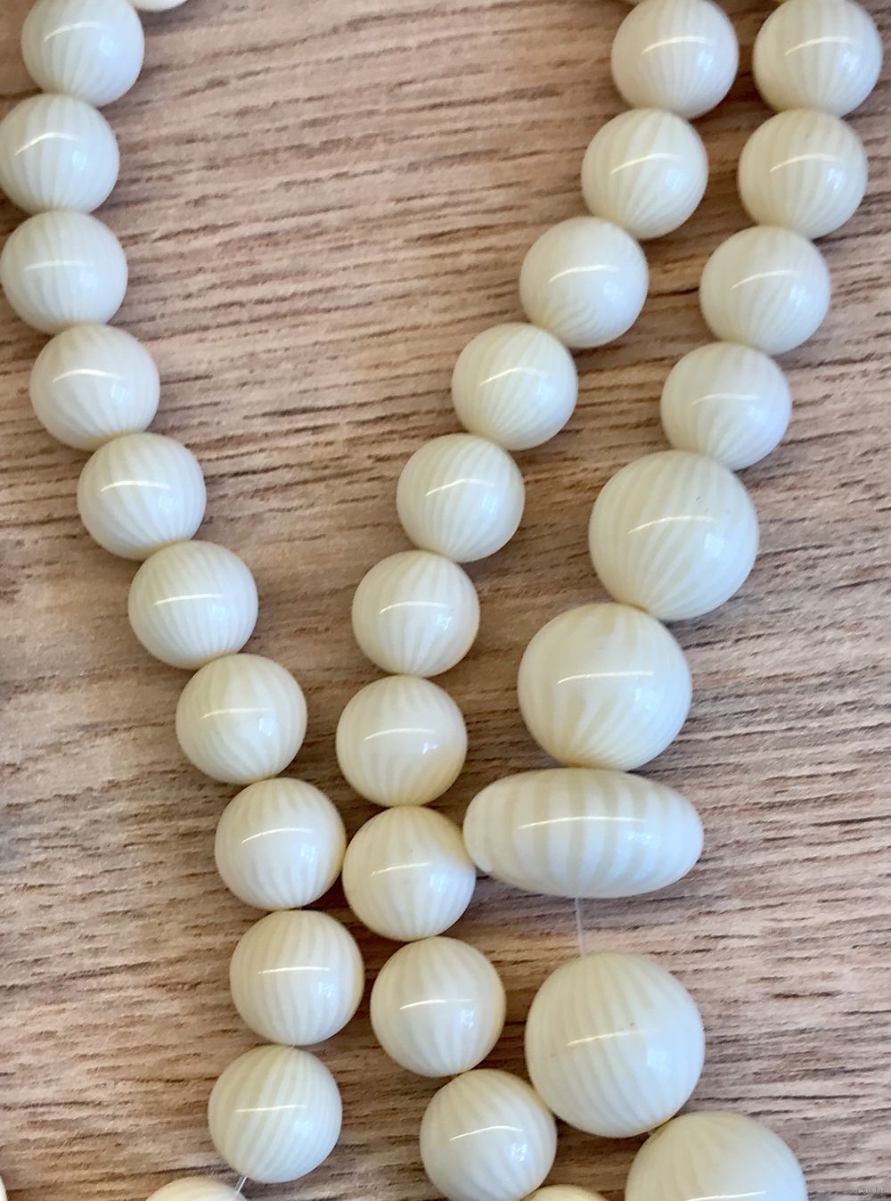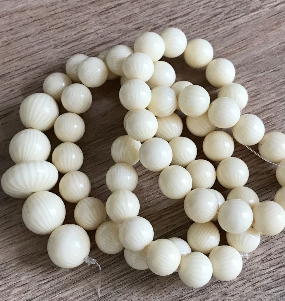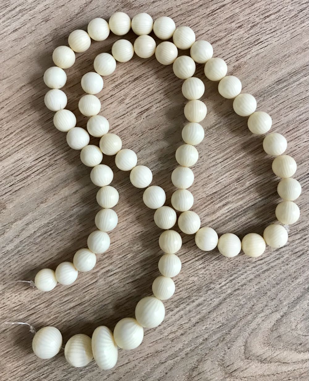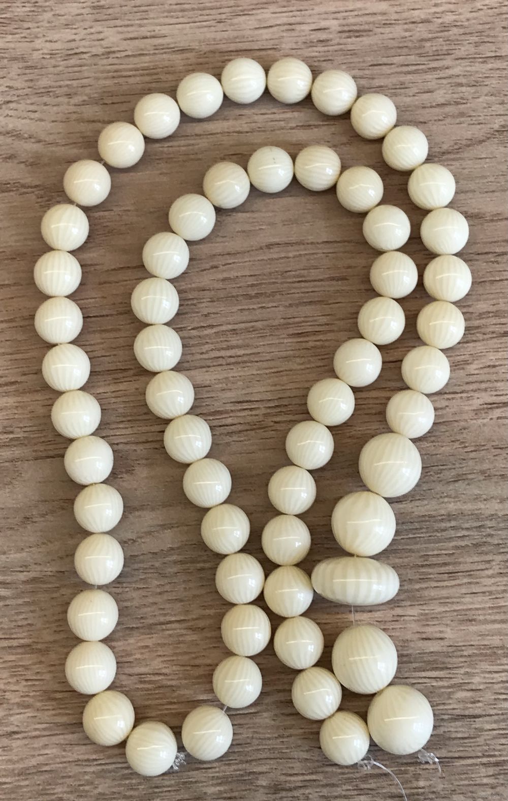 Нитка с бусинами из айворина. Первая половина ХХв. 4 бусины диаметром 1,5см., 1 бусина 2см., 55 бусин диаметром 1,2см. Длина нитки 72см.