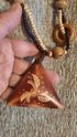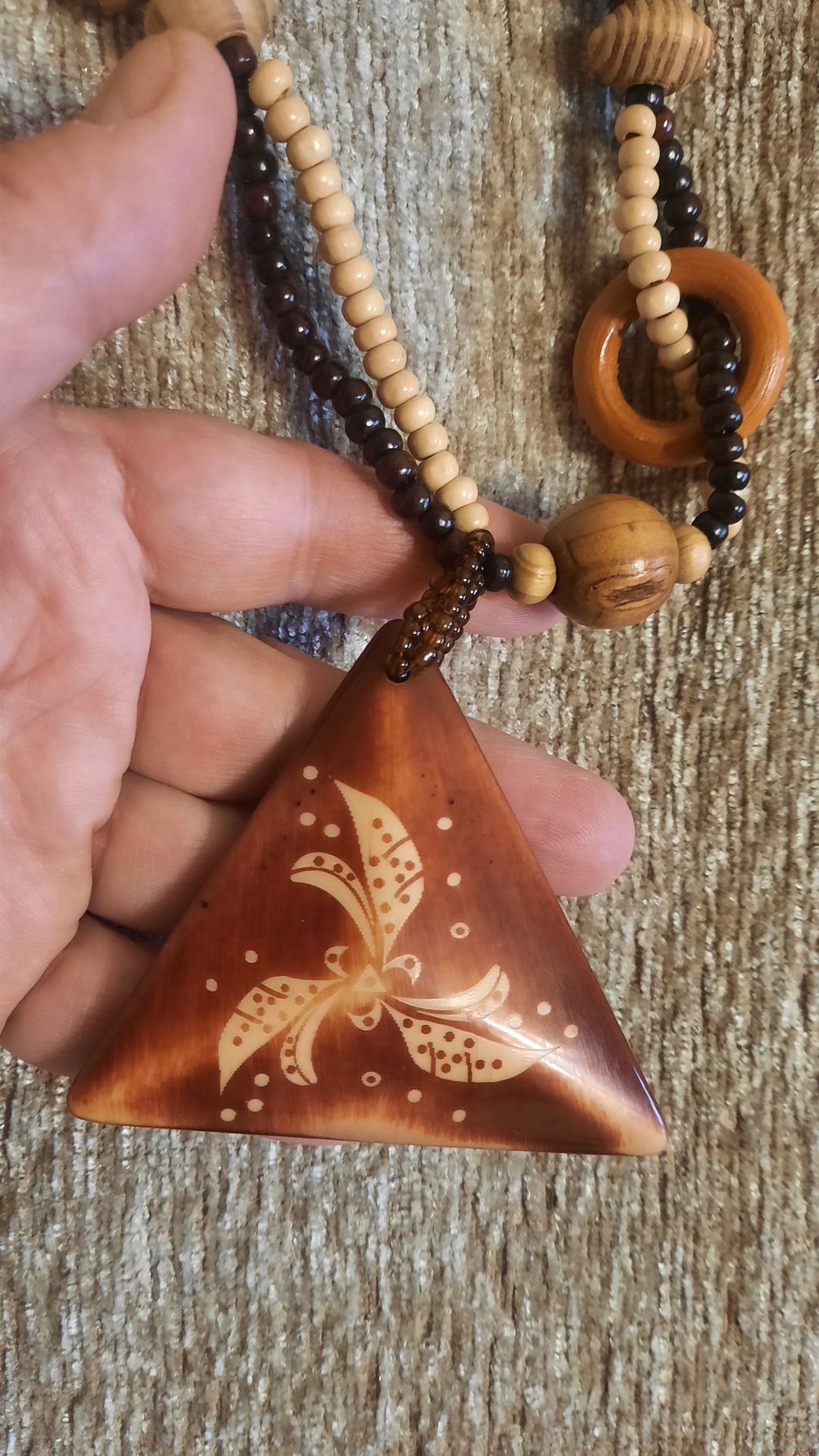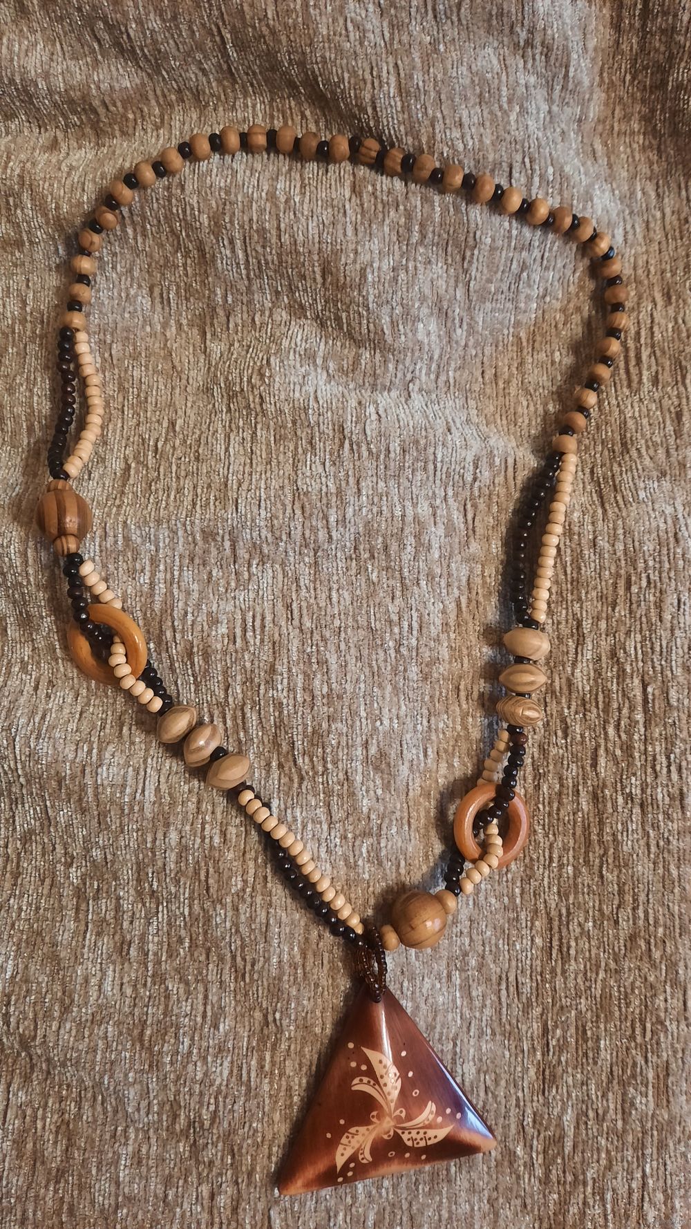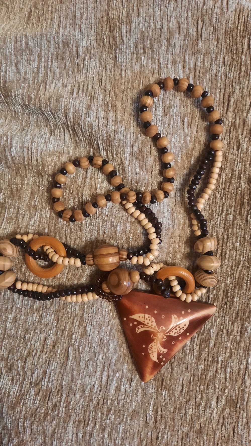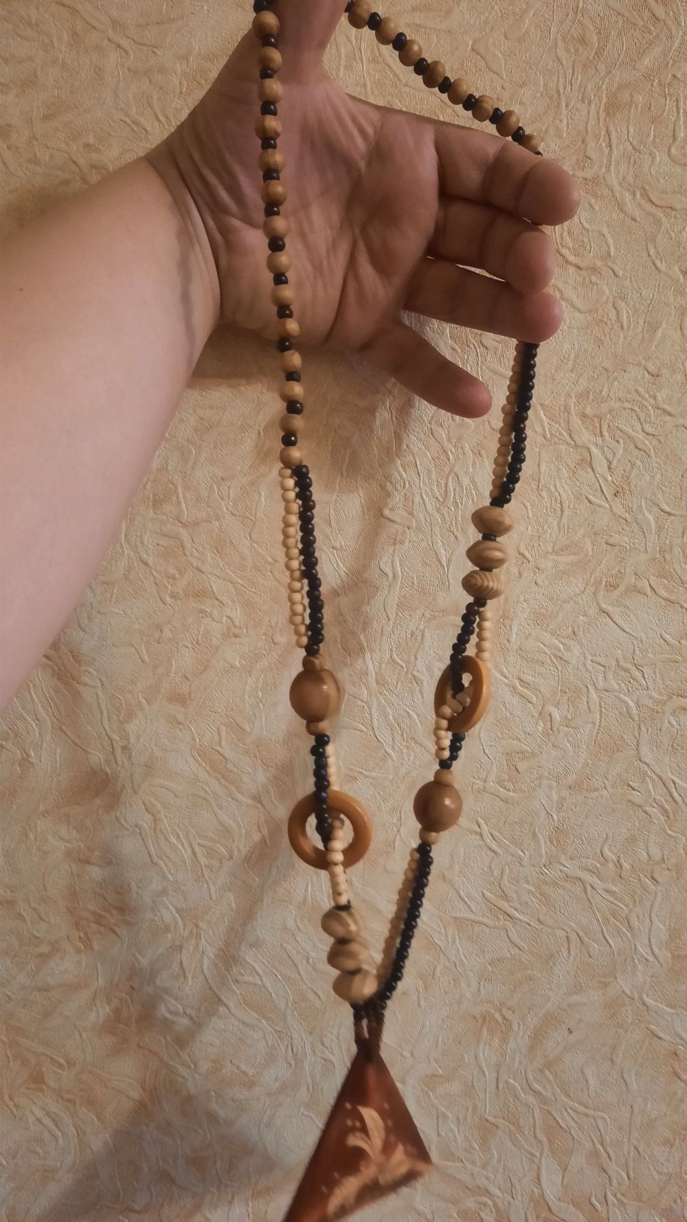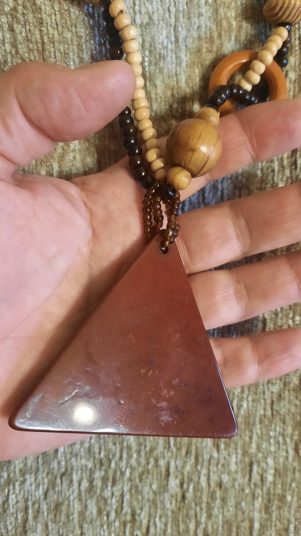 Большой треугольник из пластмассы, большие бусины и кольца из дерева, мелкие вперемешку.