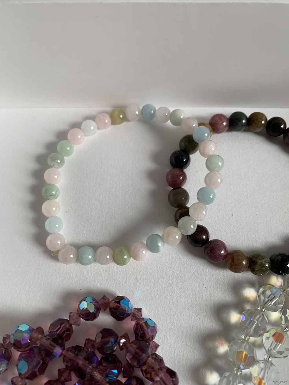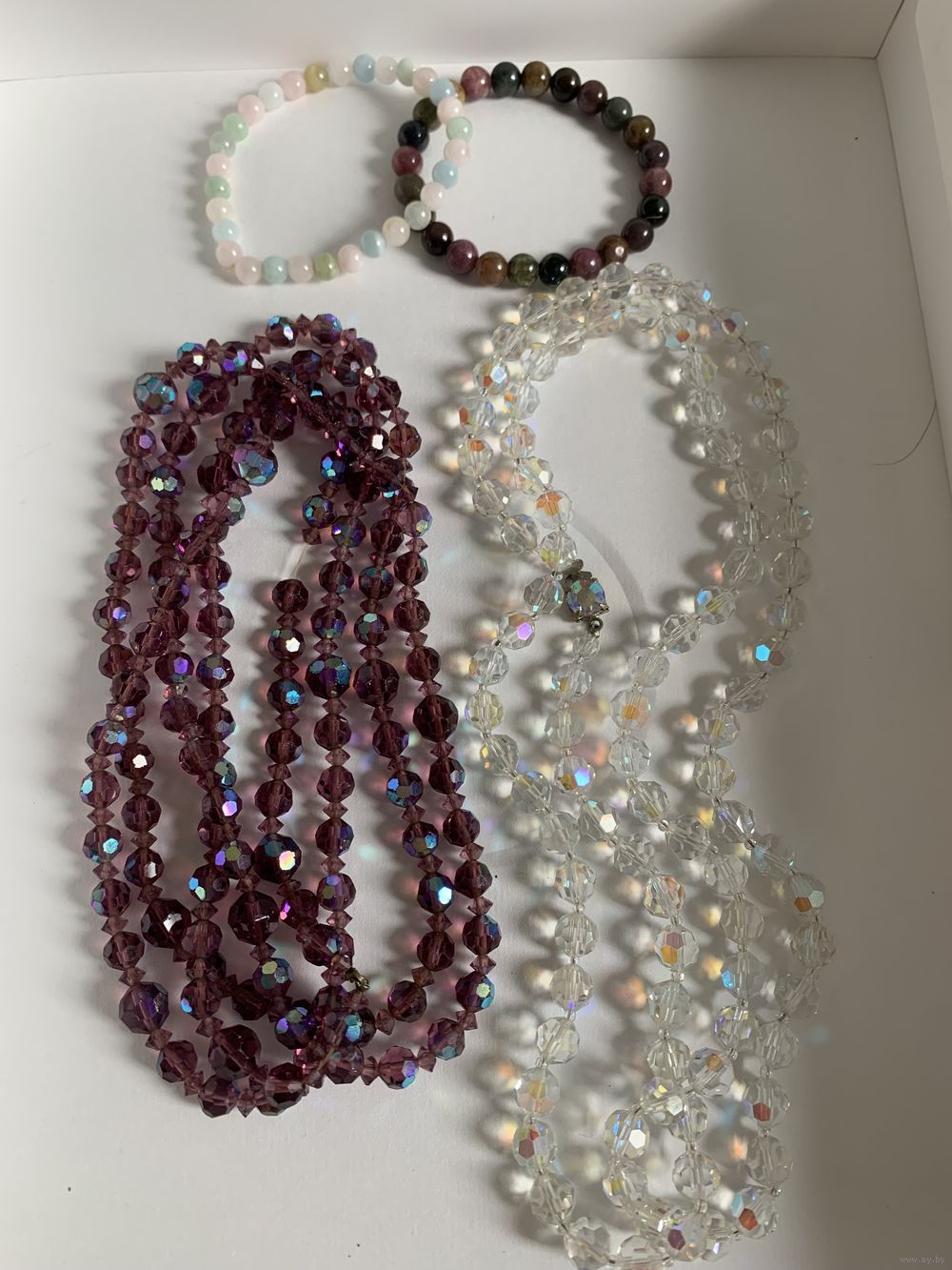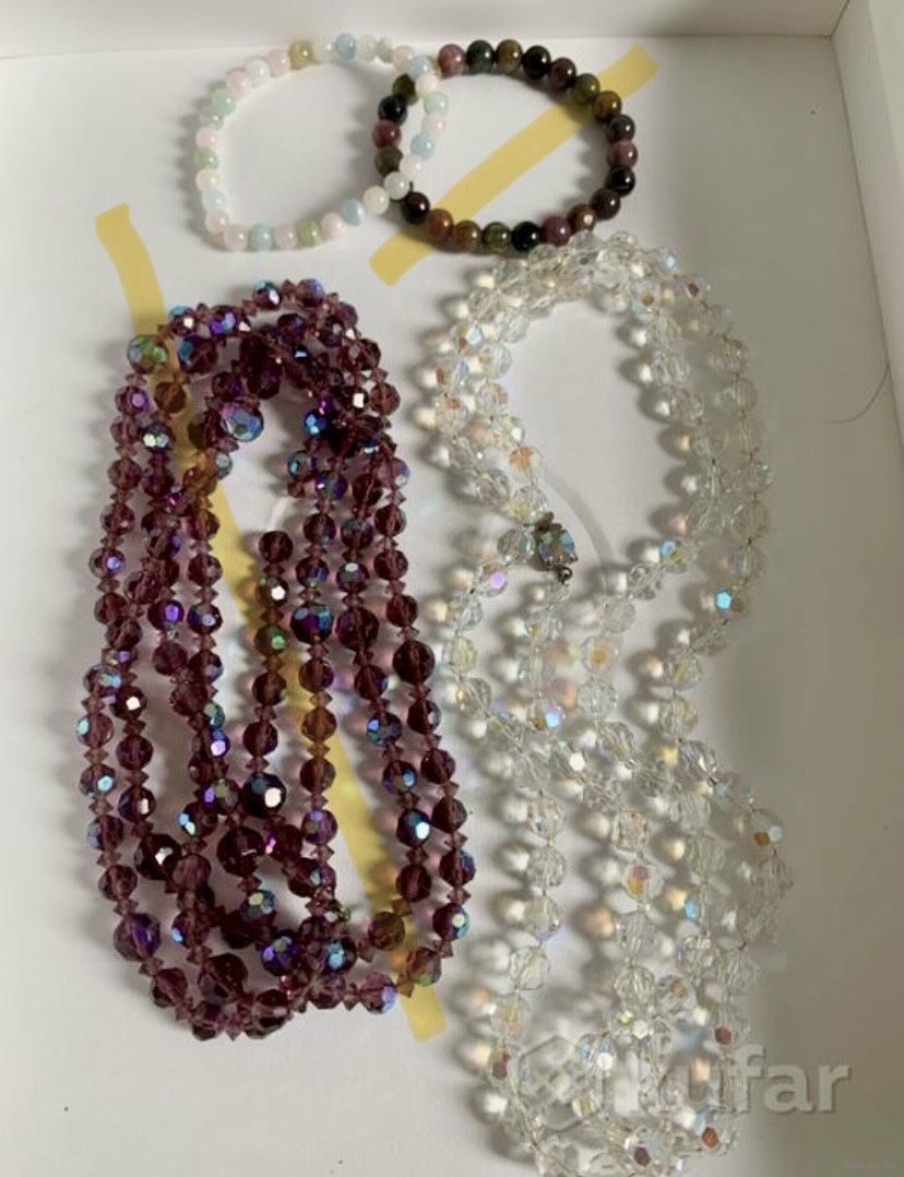 Бусы из аметистового стекла с покрытием АБ . Длина около 2 метров. Бусы из хрусталя с покрытием АБ . Длина около метра. Бусина крупная. Браслет из турмалина и берилла на резинке. Цена 50 руб. Почта любая. Оперативно
