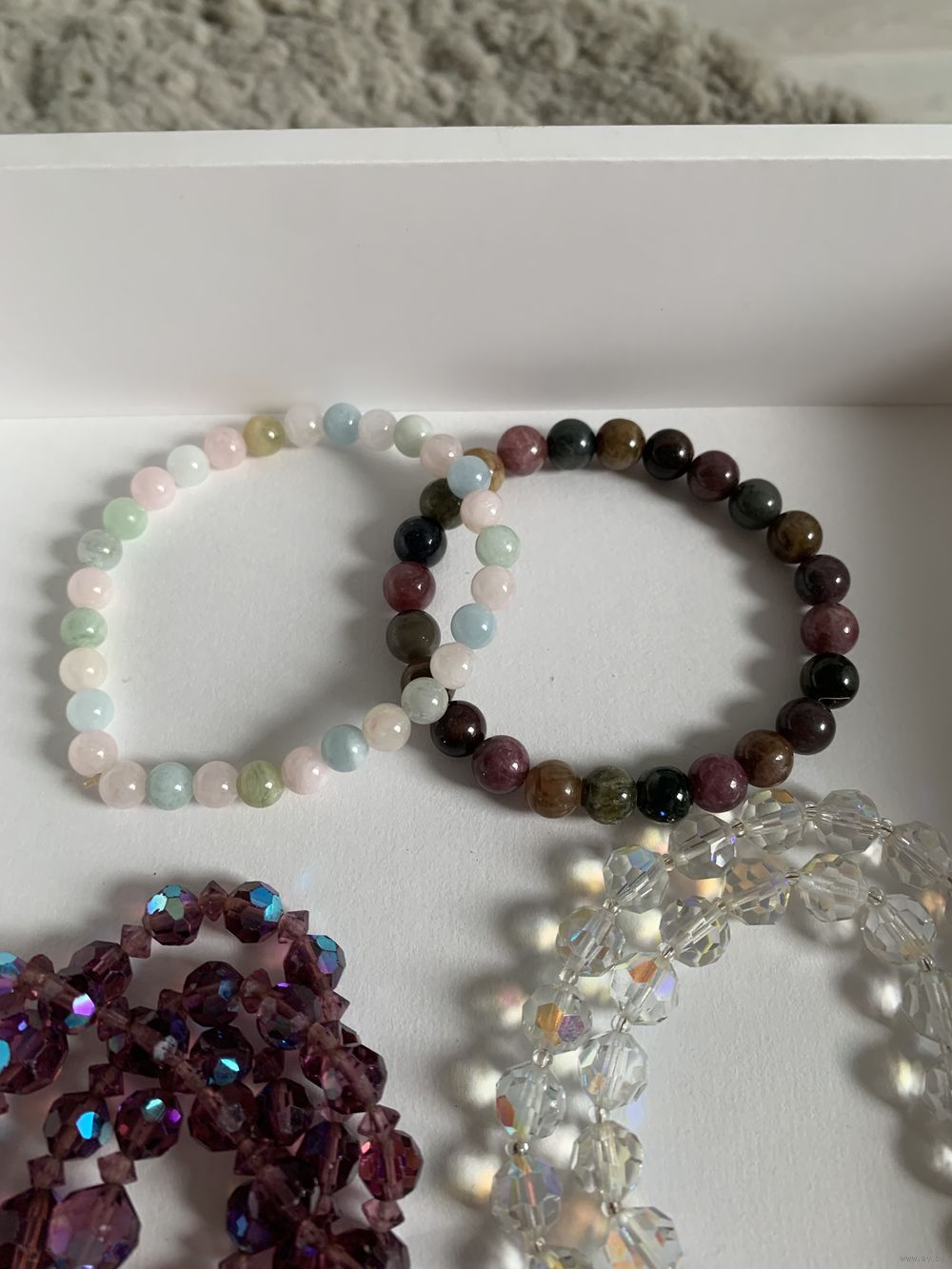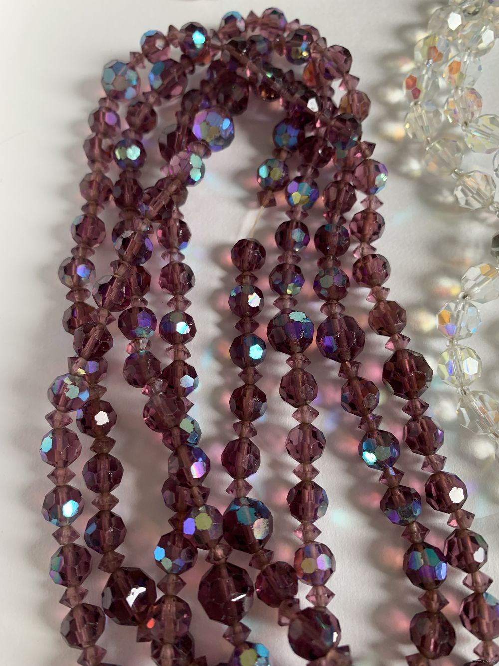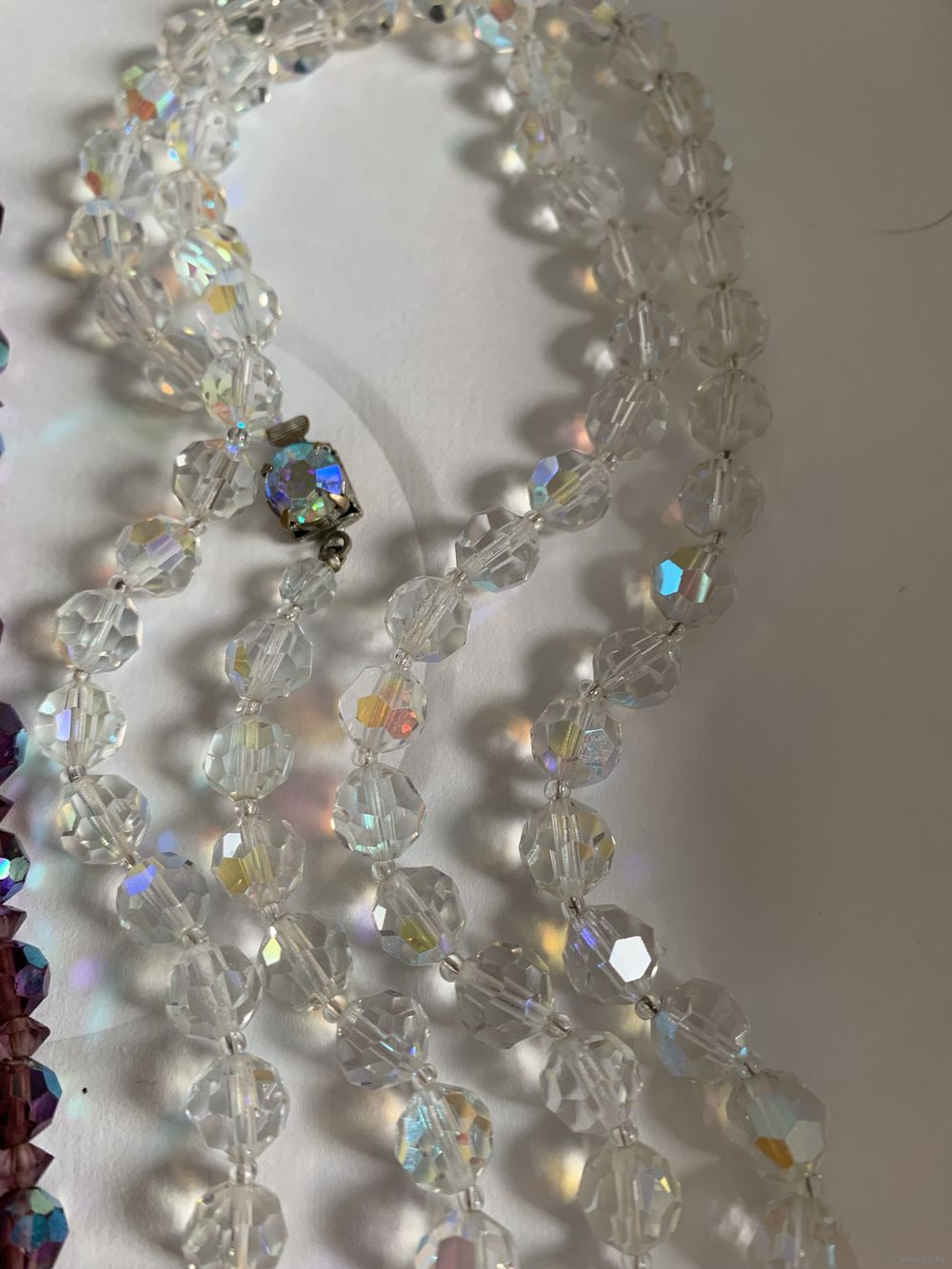 Бусы из аметистового стекла с покрытием АБ . Длина около 2 метров. Бусы из хрусталя с покрытием АБ . Длина около метра. Бусина крупная. Браслет из турмалина и берилла на резинке. Цена 50 руб. Почта любая. Оперативно
