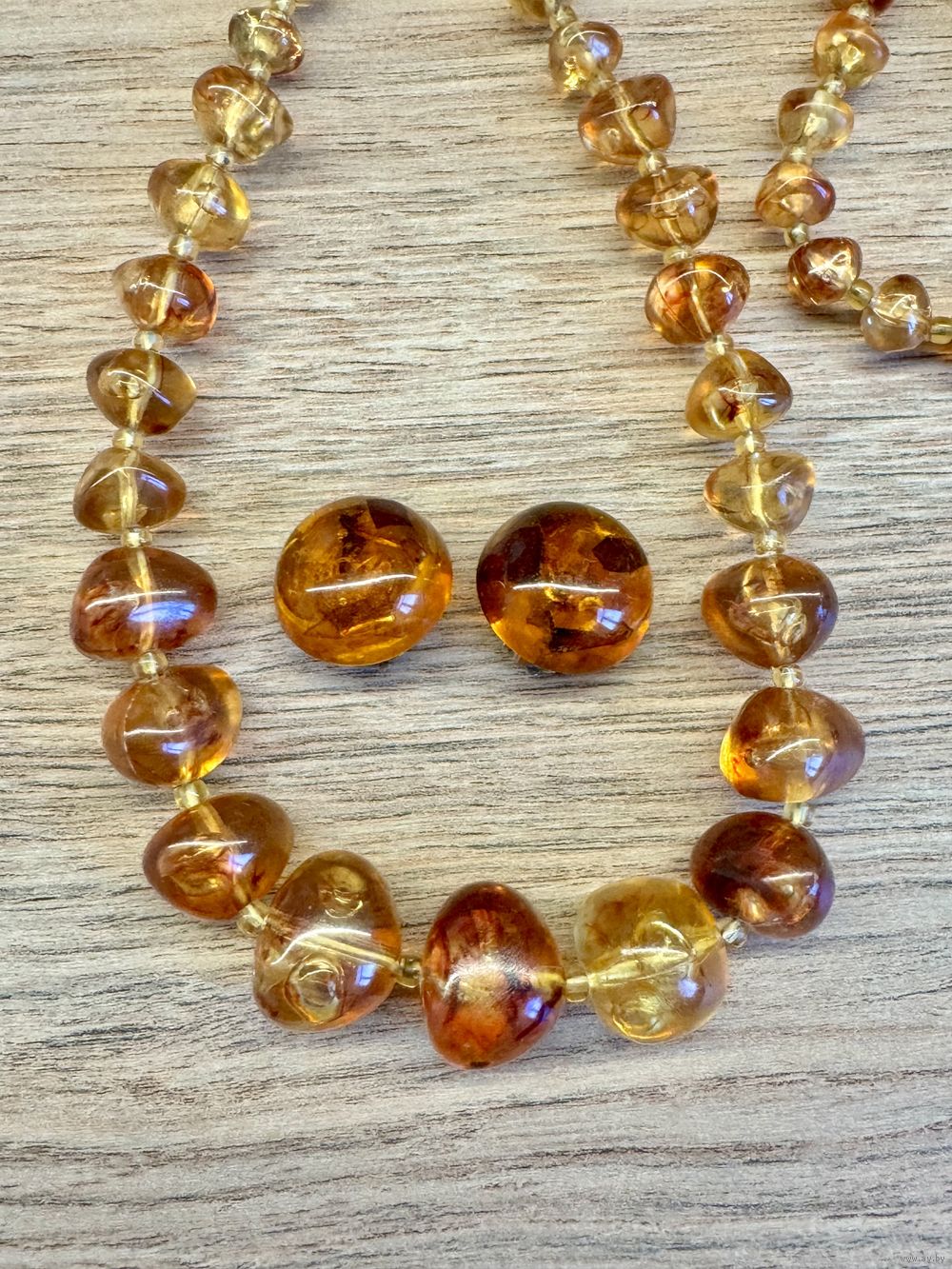 Винтажный комплект из пластика под янтарь. Длина бус 62см., диаметр клипсы 1,8см. Состояние хорошее.