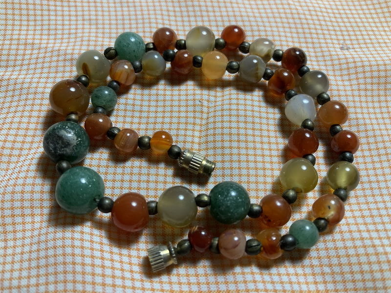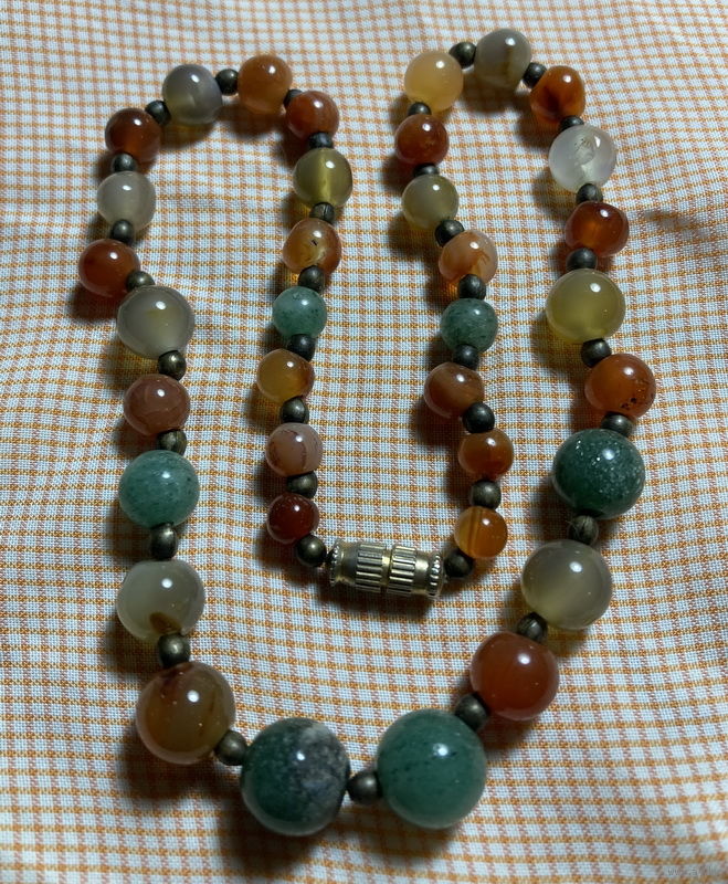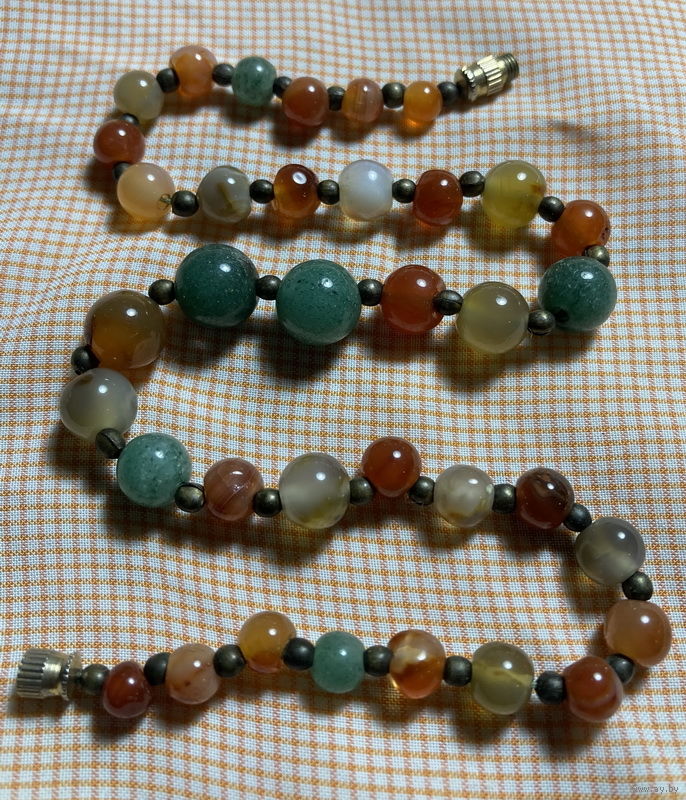 75/ Длина 36 см, самая большая бусина 10 мм, самая малая 5 мм. Закрутка металлическая, мелкие металлические шарики между бусинами