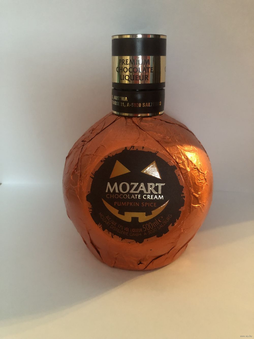 Пузатая бутылка из-под ликера «Моцарт», обернутая в красивую подарочную фольгу