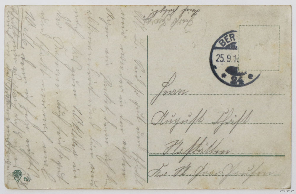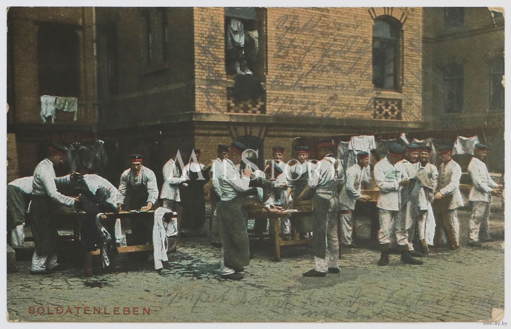 Колоризированная фото-открытка, показывающая быт немецких войск - стирку белья. Первая Мировая война. Размер 8,2 см. х 13,1 см.