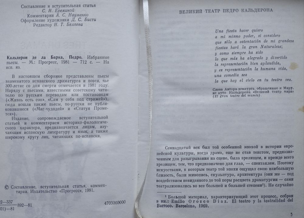 Тираж 5600 экз. 712 стр. В издание вошли комедия и три драмы знаменитого средневекового драматурга на исп. яз. Кальдерон де ла Барка Энао де ла Барреда-и-Рианьо (1600 - 1681) - испанский драматург и поэт, чьи произведения считаются одним из высших достижений испанской литературы золотого века. Он родился в Мадриде и учился в Императорском иезуитском колледже. В 13 лет он написал свою первую комедию. В 1614 году он начал обучение в университете Алькала. В 1615 году он поступил в университет Саламанки, получив степень бакалавра в 1620 году. Он служил солдатом в Италии и Фландрии, затем вернулся в Испанию. В 1637 году король пожаловал ему облачение ордена Святого Иакова. В 1615 году он был рукоположен в священники, а в 1653 году назначен капелланом. Он жил при дворе и продолжал свою литературную деятельность до своей смерти в 1681 году.