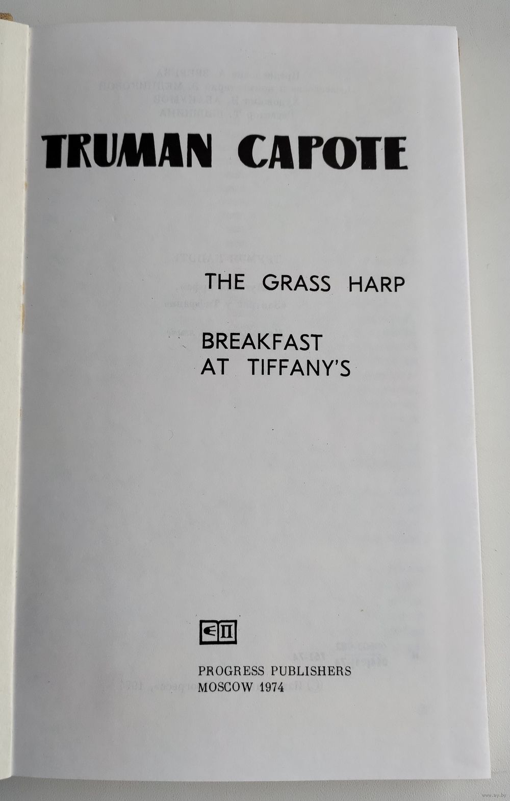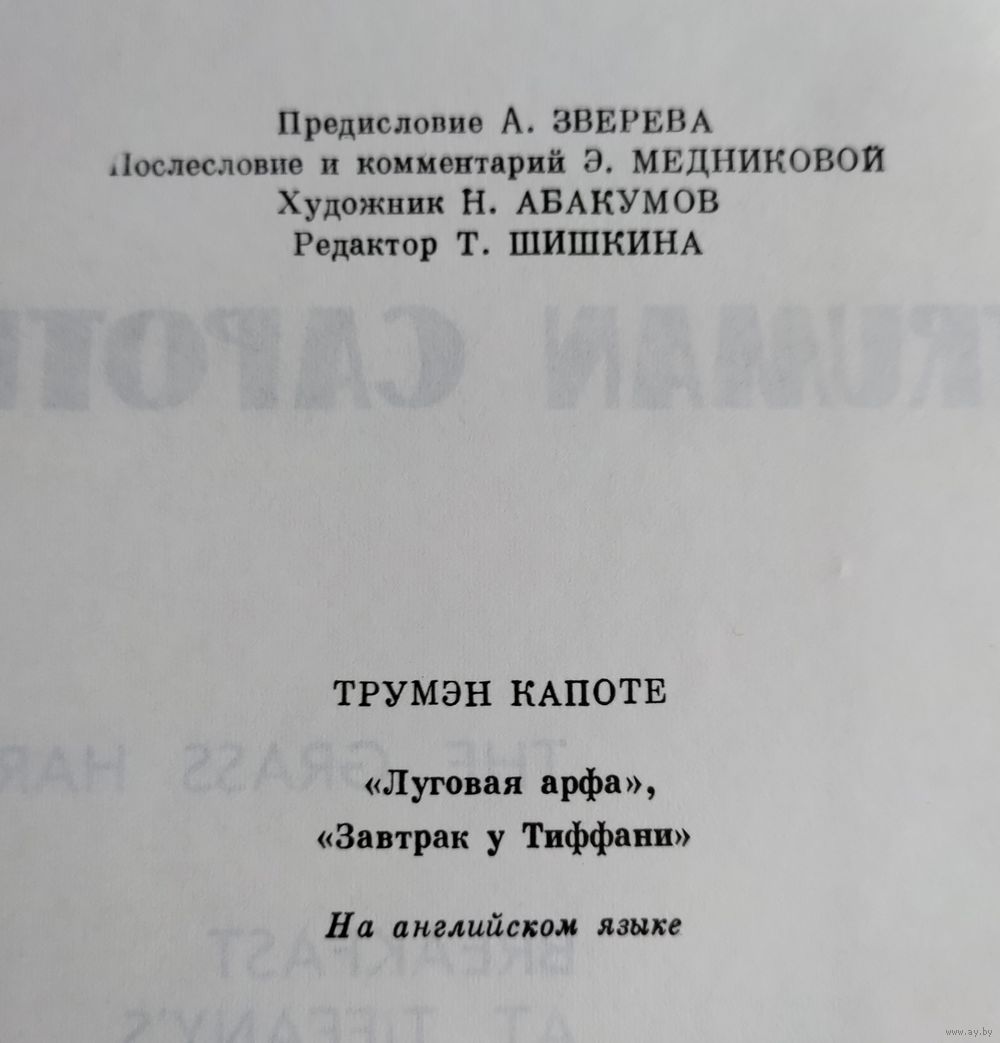 Capote Truman. The Grass Harp. Breakfast at Tiffanys. Предисловие А. Зверева. Послесловие и комментарий Э. Медниковой. Худ. Абакумов Н. М.: Прогресс, 1974г., 223 с. Твёрдый переплёт, обычный формат.