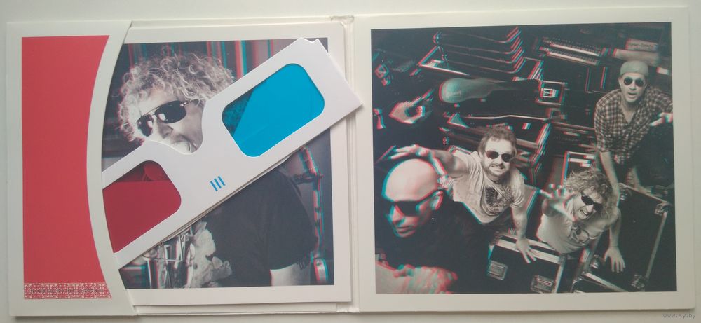 comes with paper blue/red 3-D glasses to view 3D images on cards of band members.