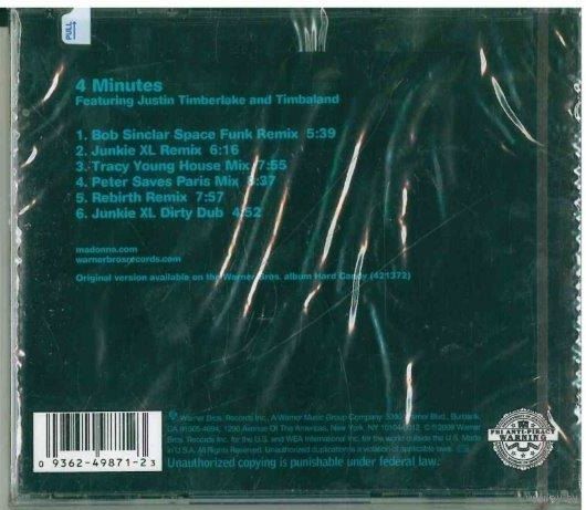 Madonna is the only credited artist on the spine of the case. The back cover, disc and liner notes credit Justin Timberlake and Timbaland as featuring artists. "Madonna & Justin" is shown on the front cover like the other commercial releases.