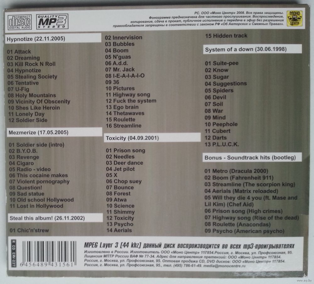 Hypnotize (22.11.2005)1Attack2Dreaming3Kill Rock N Roll4Hypnotize5Stealing Society6Tentative7U-Fig8Holy Mountains9Vicinity Of Obscenity10Shes Like Heroin11Lonely Day12Soldier SideMezmerize (17.05.2005)13Soldier Side (Intro)14B.Y.O.B.15Revenge16Cigaro17Radio-Video18This Cocaine Makes19Violent Pornography20Question!21Sad Statue22Old School Hollywood23Lost In HollywoodSteal This Album! (26.11.2002)24Chic 'N' Strew25Innervision26Bubbles27Boom28N' Guas29A.D.D.30Mr. Jack31I-E-A-I-A-I-O323633Pictures34Highway Song35Fuck The System36Ego Brain37Thetawaves38Roulette39StreamlineToxicity (04.09.2001)40Prison Song41Needles42Deer Dance43Jet Pilot44X45Chop Suey46Bounce47Forest48Atwa49Science50Shimmy51Toxicity52Psycho53Aerials54Hidden TrackSystem Of A Down (30.06.1998)55Suite-Pee56Know57Sugar58Suggestions59Spiders60Devil61Soil62War63Mind64Peephole65Cubert66Darts67P.L.U.C.K.Bonus - Soundtrack Hits (Bootleg)68Metro (OST Dracula 2000)69Boom (OST Fahrenheit 911)70Streamline (The Scorpion King)71Aerials (Matrix Reloaded)72Will They Die 4 You (Chef Aid)