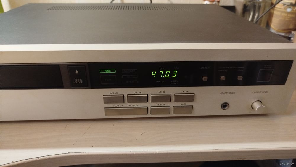 Выпуск: конец 1985 года, у меня с 2019. Японец, мультивольтажный. Состояние на 4+, со всех сторон на фото. Пультовой, пульта нет. Читает CD, CD-R (последние иногда даже увереннее, чем фабричные российские пиратки под конец), читает царапанные диски, продемонстрирую при прослушивании. На последних треках пираток бывает заикается. Дискретный выход (транзисторы), выходы - только аналоговые, цифровых нет никаких. Регулируемый выход до 2в (потенциометр на передней панели возле гнезда для наушников регулирует и ушной, и линейный выходы). ЦАП 16 bit Burr Brown