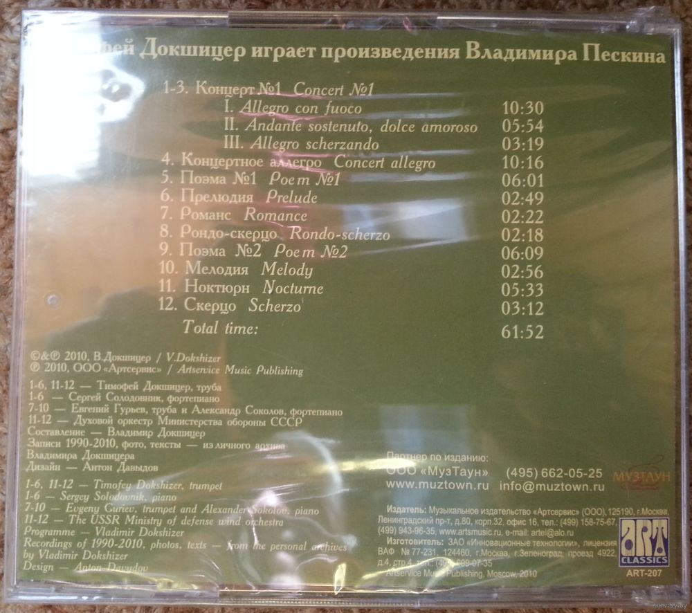 Данный диск представляет творчество малоизвестного композитора Владимира Пескина. Практически все произведения для трубы были созданы в творческом содружестве с трубачом Тимофеем Докшицером. Серьезность и разнообразие творческих интересов, высокая исполнительская культура, замечательное профессиональное мастерство - вот качества, которые характеризуют великого музыканта ХХ века, народного артиста России, профессора Тимофея Александровича Докшицера. Более ста произведений записал Тимофей Докшицер на пластинки и CD. К сожалению, сочинения Владимира Пескина Тимофею Александровичу удалось записать не все. По инициативе брата Владимира Александровича Докшицера, хранителя наследия Тимофея Докшицера и Владимира Пескина, были записаны практически все недостающие произведения для трубы Владимира Ананьевича Пескина. На данном диске четыре (7-10) произведения исполнены лауреатами международных конкурсов, солистами оркестра Большого театра, яркими и безусловно талантливыми исполнителями, трубачем Евгением Гурьевым и пианистом Александром Соколовым.