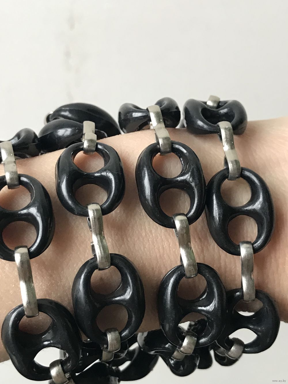 Крупная цепь из пластика и металла. Длина украшения 89см.+20см. доп.цепочка. Размер звена 2х1,5см. Можно носить как пояс. Состояние хорошее.