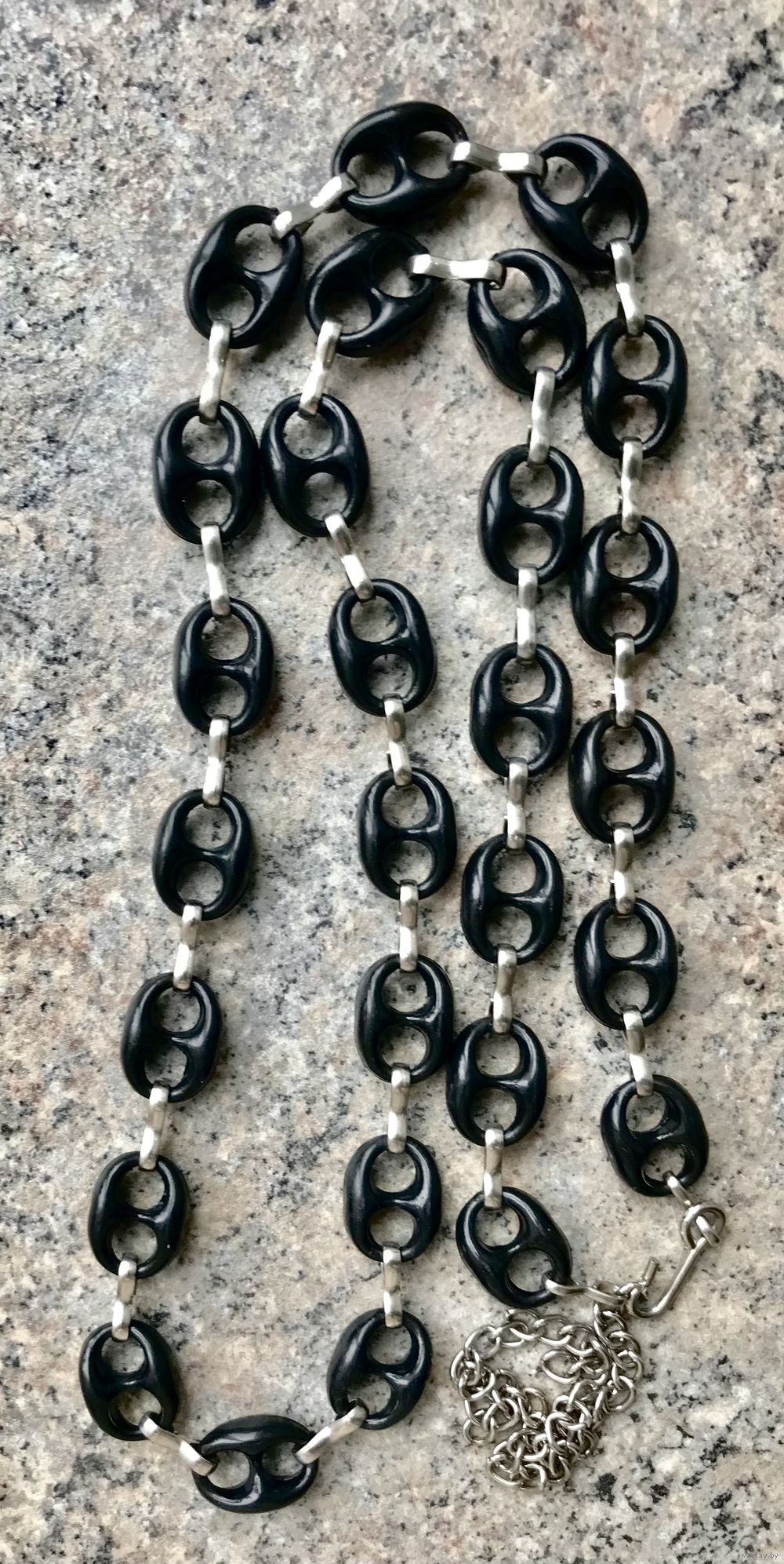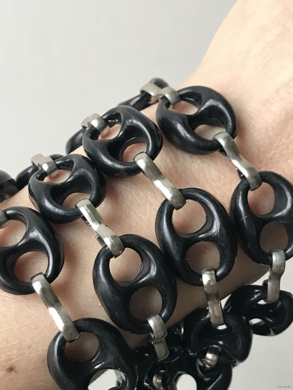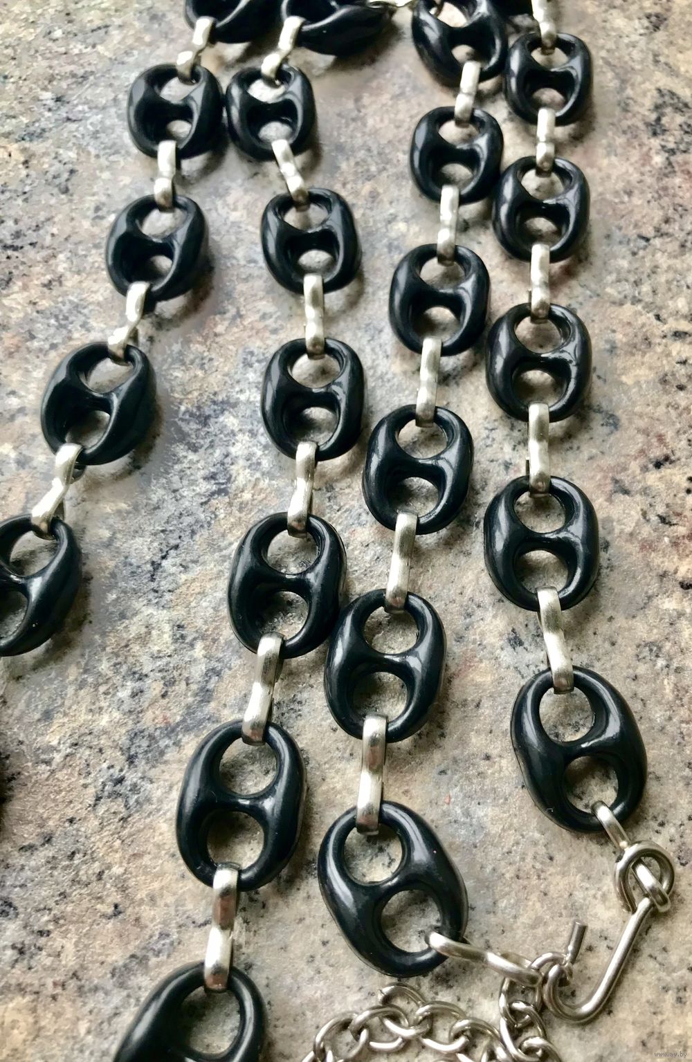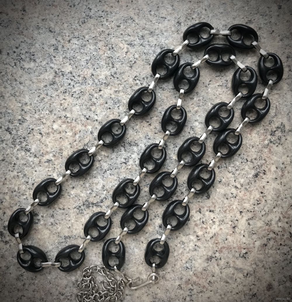 Крупная цепь из пластика и металла. Длина украшения 89см.+20см. доп.цепочка. Размер звена 2х1,5см. Можно носить как пояс. Состояние хорошее.