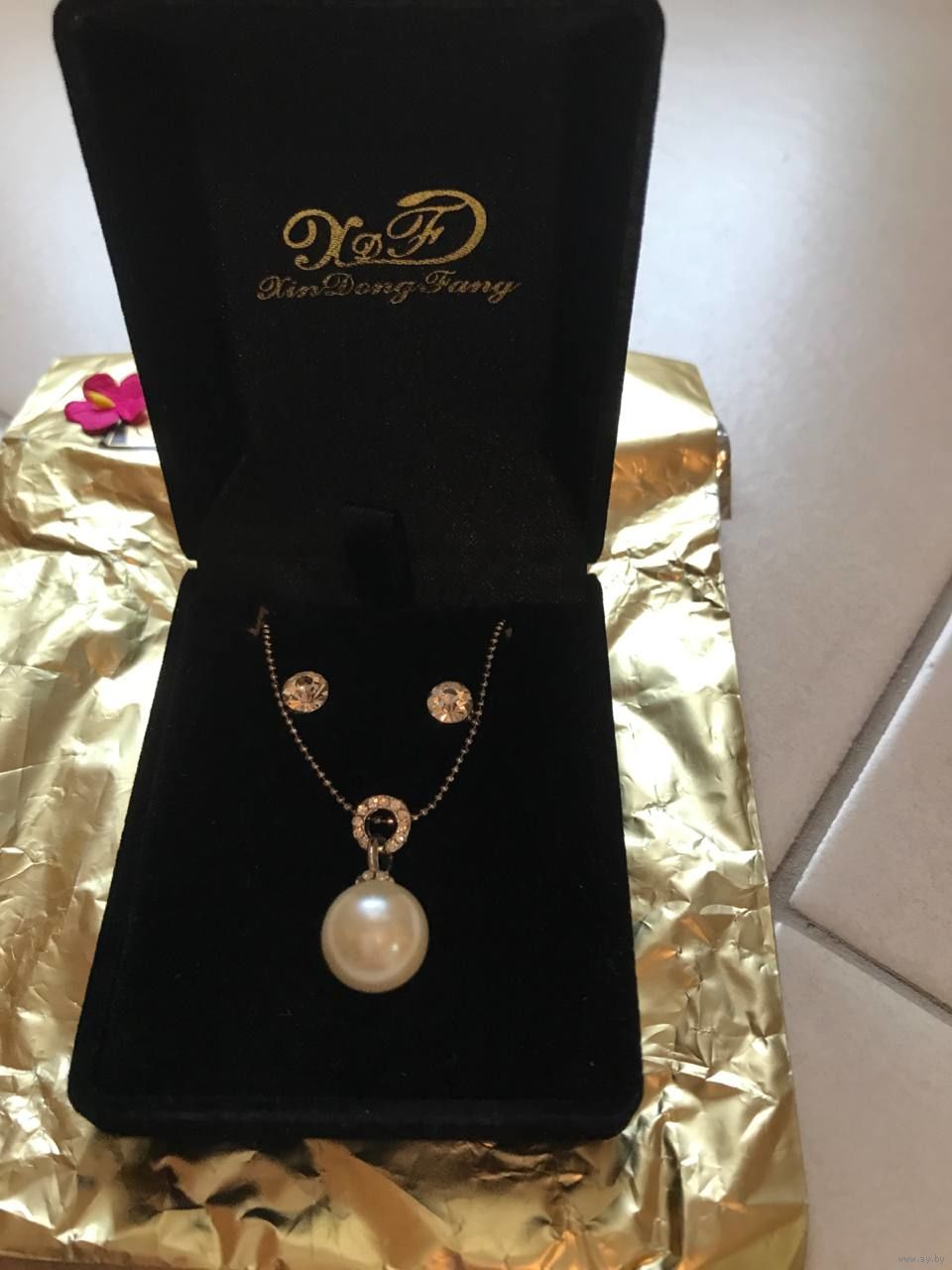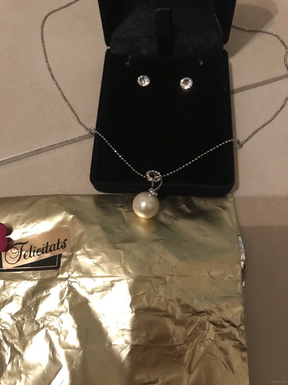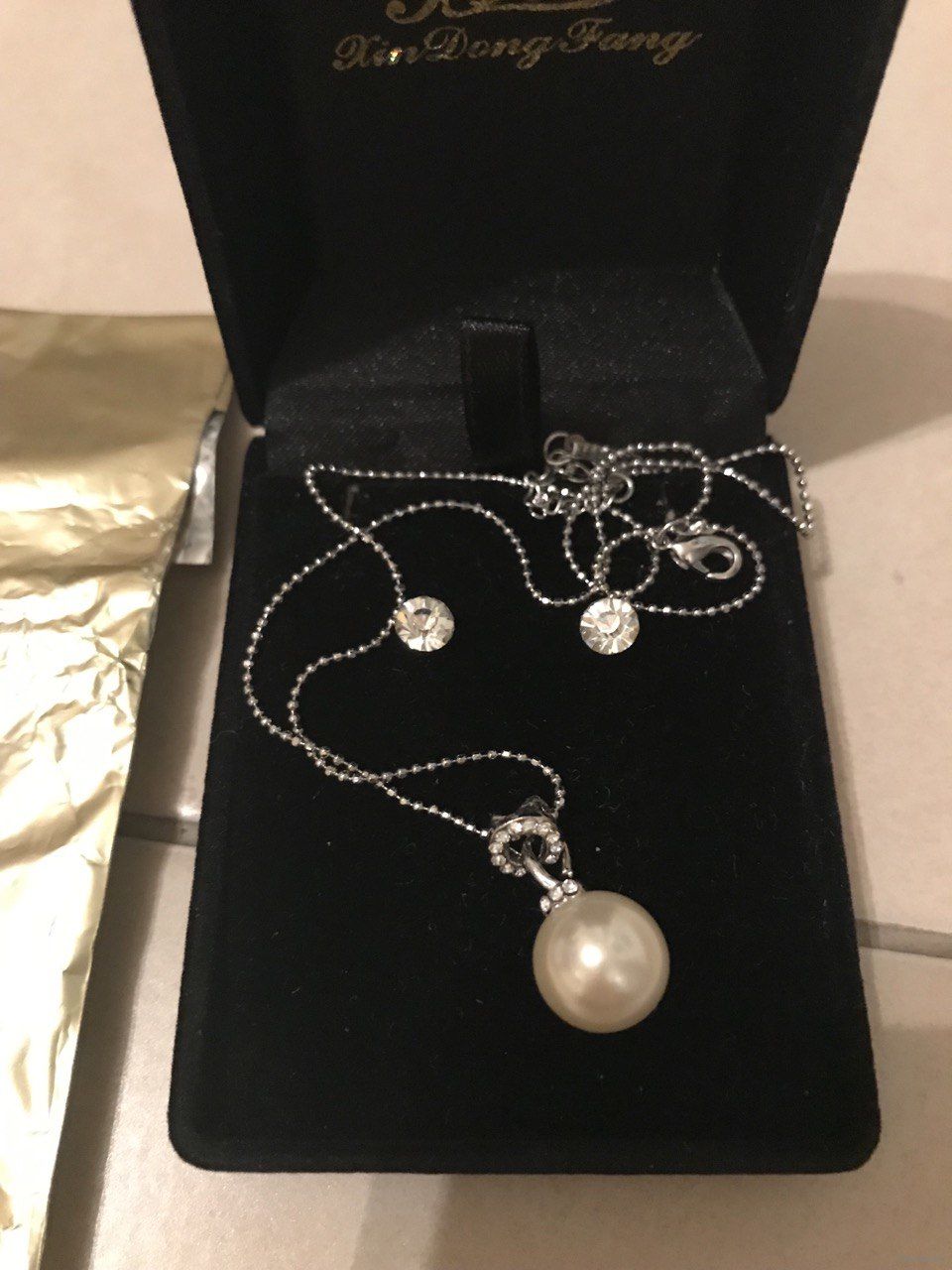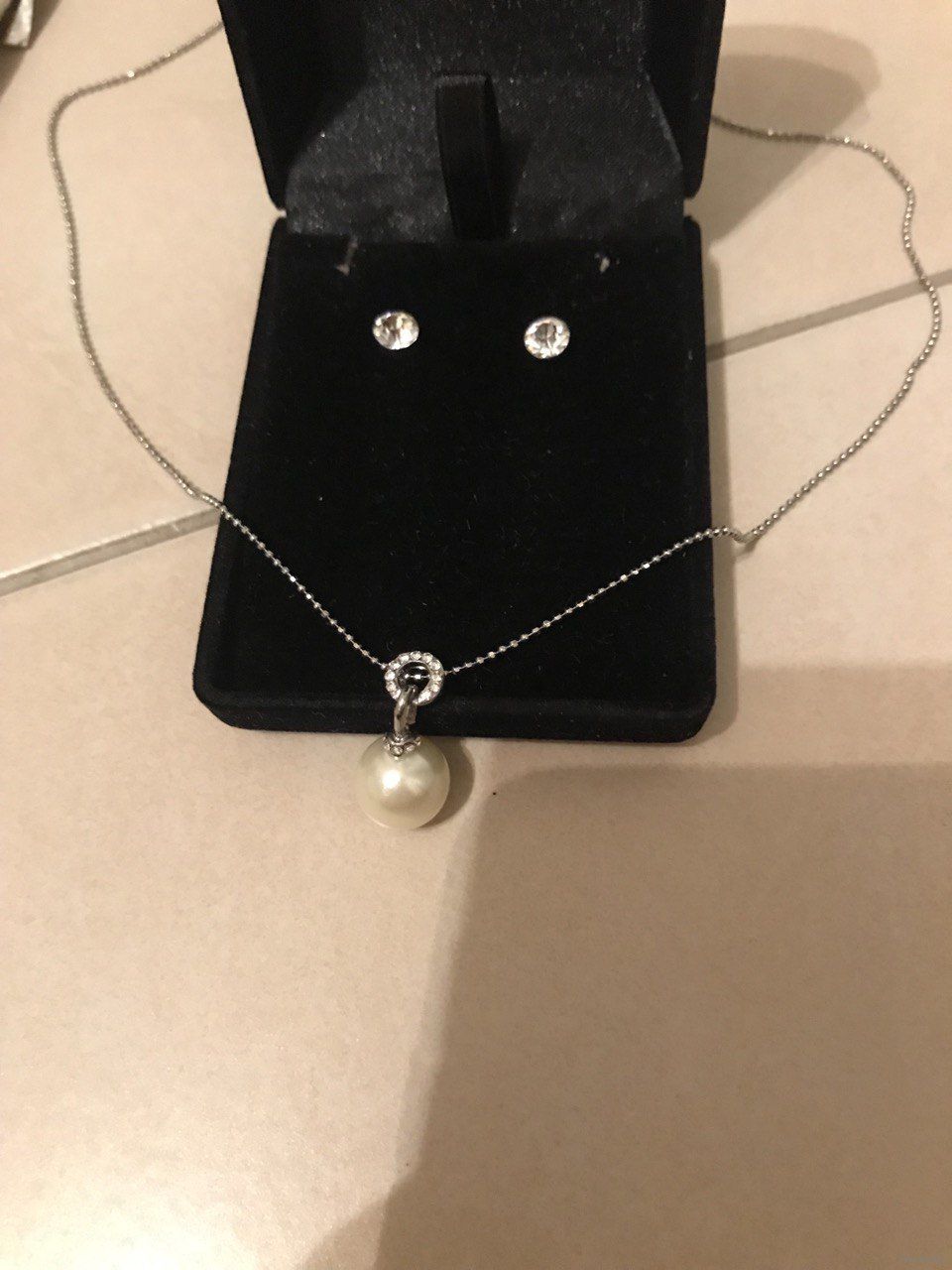 Набор в коробке с упаковкой - Цепочка шарикового плетения с кулоном под жемчуг и сережки-гвоздики с блестящими кристаллами - абсолютно новый, не примерялся, куплен в Испании.