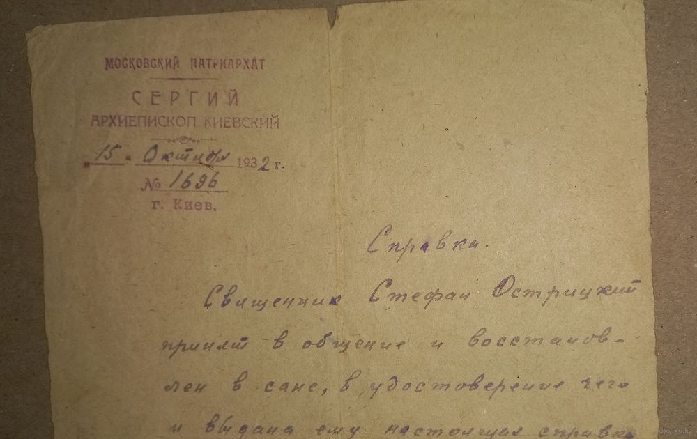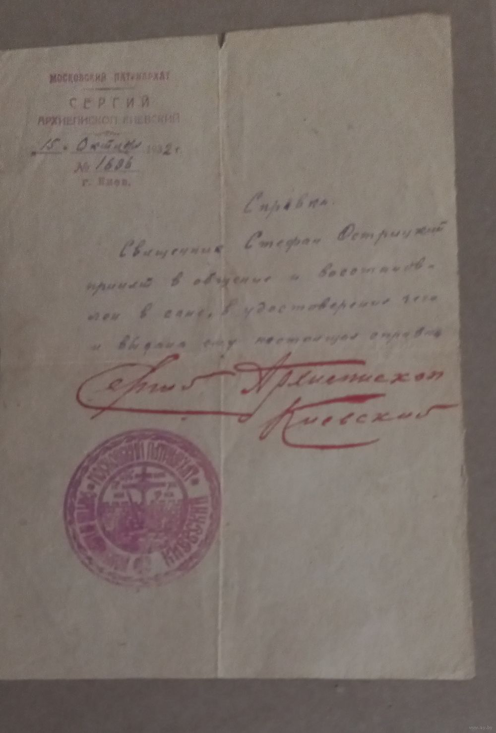 церковная справка востановление в должности автограф врхиепископа КИЕВСКОГО СЕРГИЯ 1932 г печать
