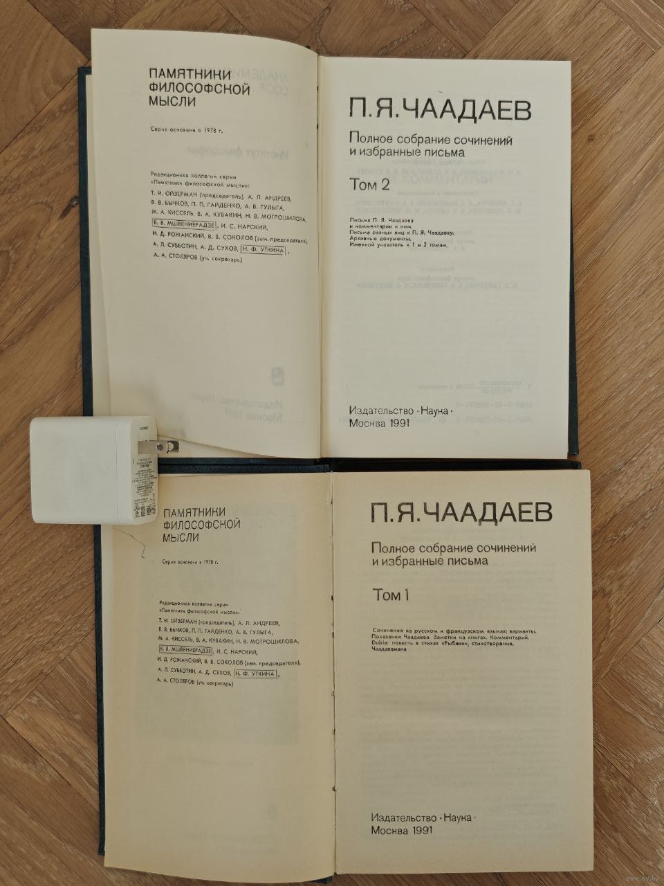 Двухтомник одного из самых известных, даже скандально известных русских философов XIX века Петра Яковлевича Чаадаева (1794-1856), героя Отечественной войны 1812 года, участника Бородинского сражения, за храбрость награжденного орденами, близкого друга А. Пушкина и А. Грибоедова. Первый посвятил ему знаменитое стихотворение (Любви, надежды, тихой славы Недолго нежил нас обман...), а для второго он стал прототипом главного героя пьесы `Горе от ума` Чацкого. Из аннотации: `Настоящее издание является наиболее полным собранием работ, написанных Чаадаевым. Мы даже дерзнули назвать его Полным собранием сочинений. Это так, насколько можно употребить понятие полное применительно к наследию Чаадаева, который на протяжении большей части своей творческой зрелости не имел права печататься, и многие автографы его сочинений и писем к разным лицам еще не разысканы. Однако можно с уверенностью сказать, что настоящее издание если и может быть расширено, то незначительно. Коллектив, работавший над подготовкой издания, стремился дать тексты максимально аутентичные тем документам, которые, ввиду отсутствия автографов, можно считать первоисточными. Помимо полноты и аутентичности хотелось бы сказать еще о двух особенностях нашего издания. Впервые в истории не только советской, но и мировой практики издания чаадаевских текстов мы публикуем все сочинения, написанные по-французски, на языке оригинала. Мы сочли небезынтересным для читателей ввести в 1 том раздел Dubia, в который включены неизвестная ранее поэма Рыбаки и стихотворение на французском языке, написанные рукой Чаадаева, а также раздел Чаадаевиана (Чаадаев говаривал...). Во второй том вошли письма П. Я.Чаадаева и комментарии к ним. Письма разных лиц к П.Я.Чаадаеву`. Ответственный редактор и автор вступительной статьи - доктор философских наук З. А. Каменский. Много иллюстраций - фотографий и рисунков на полностраничных вклейках.