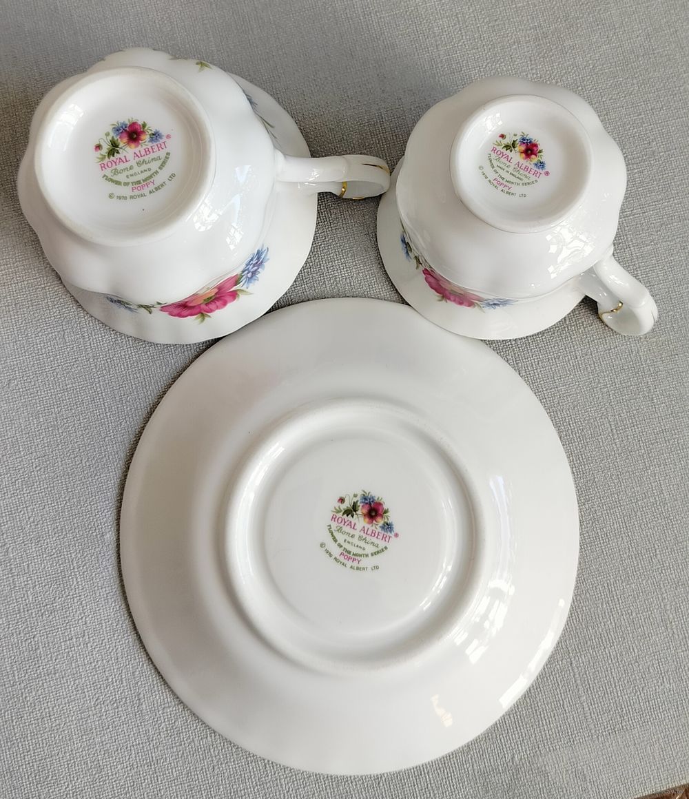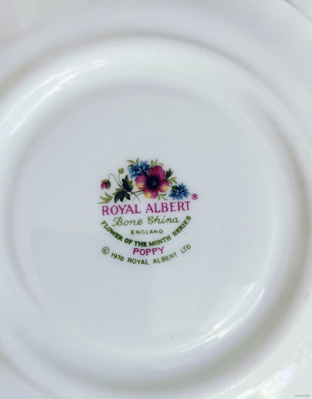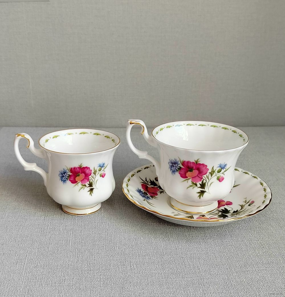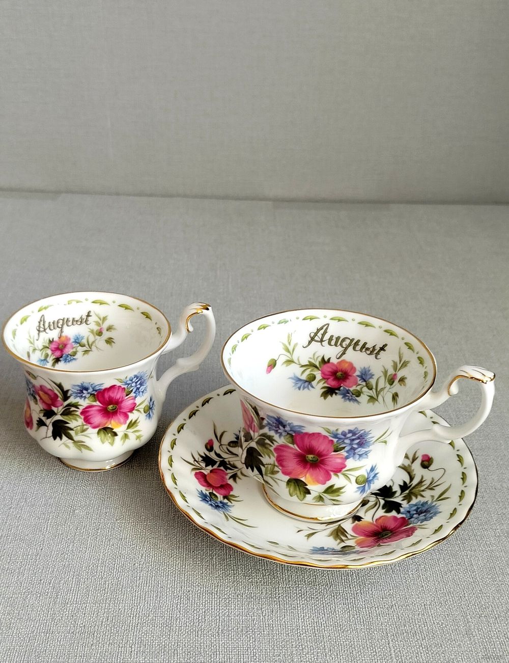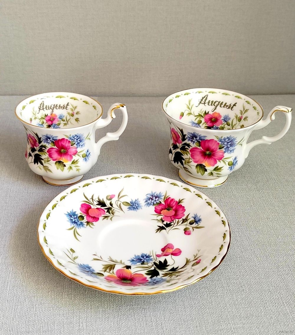 Одним лотом. Чайная и кофейная чашки с блюдцем от престижного бренда Royal Albert, Англия, 1970 года. Украшенные очаровательным цветочным мотивом и отделанные 22-каратной золотой окантовкой, чашки с блюдцем относится к серии «Цветок месяца» и олицетворяет месяц «август». Изготовлены из костяного фарфора ( клеймо - china bone – с англ. «костяной фарфор»)