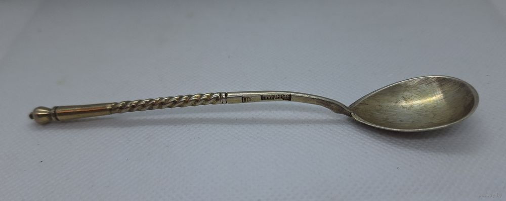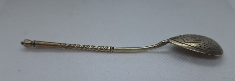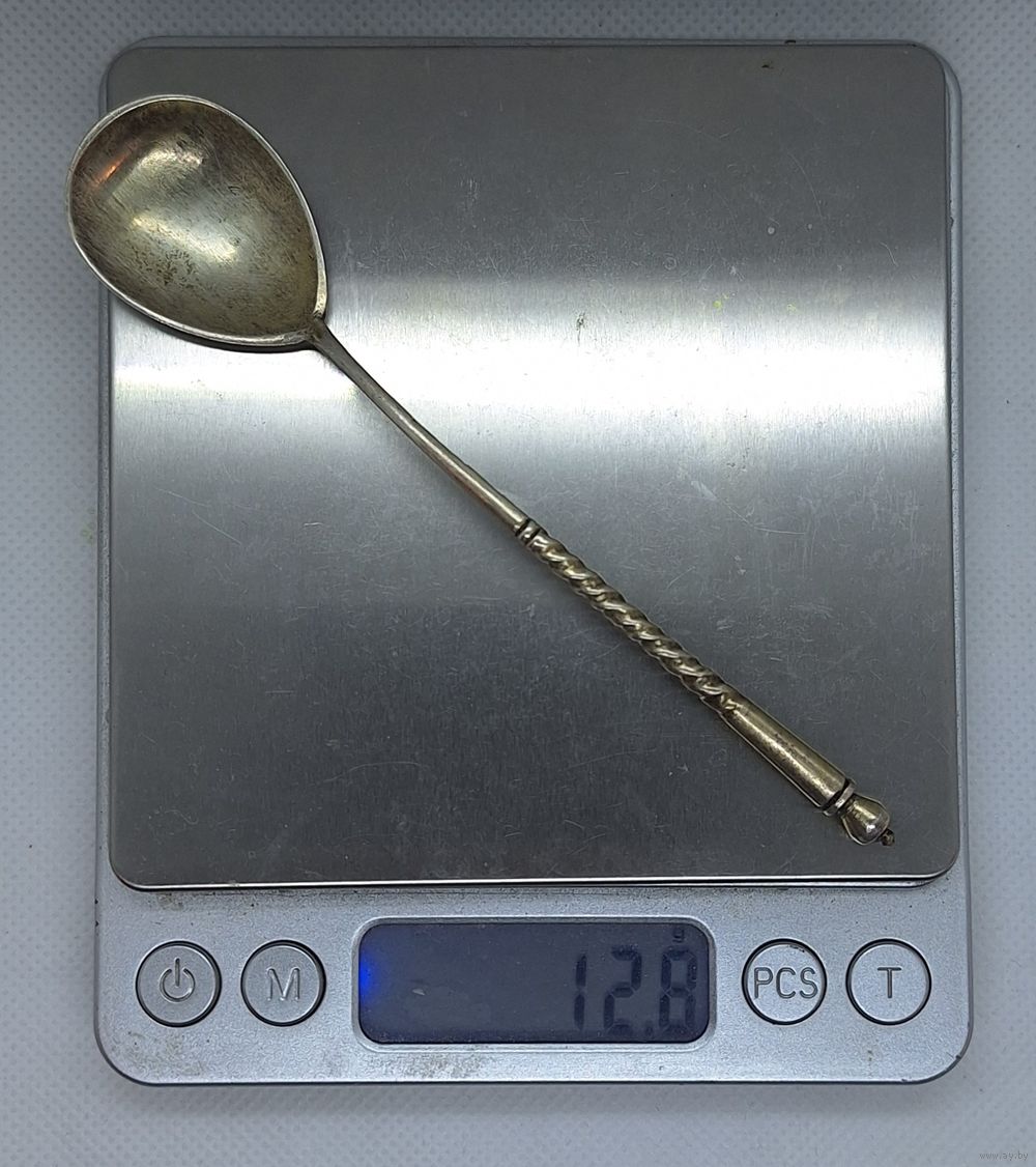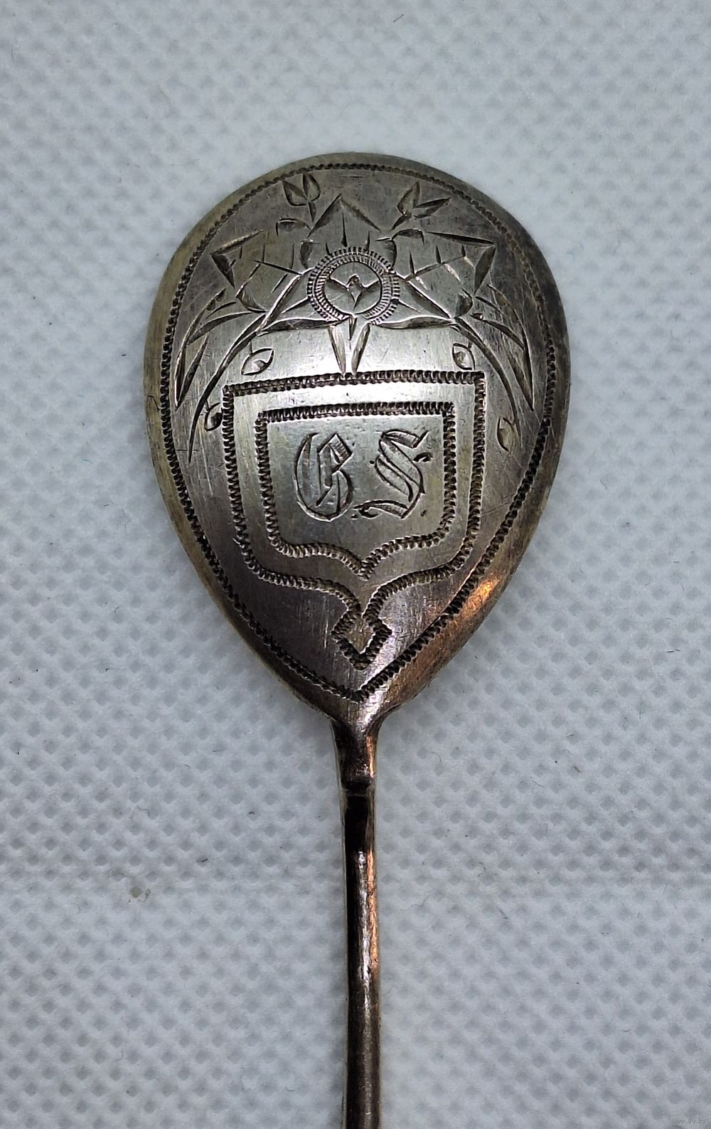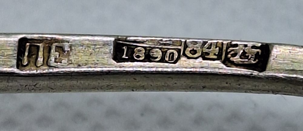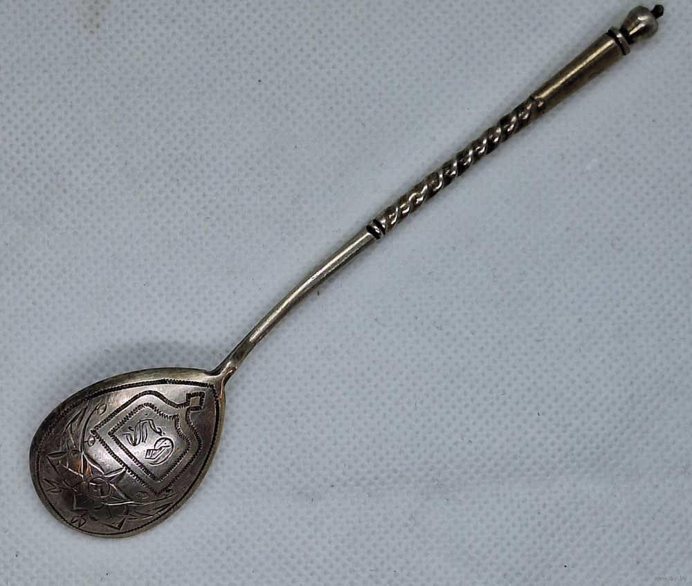 Чайная ложка, серебро, 84 пр. 1890 г., длинна: 12,3 см. Вес: 12,8 гр. Штихель.