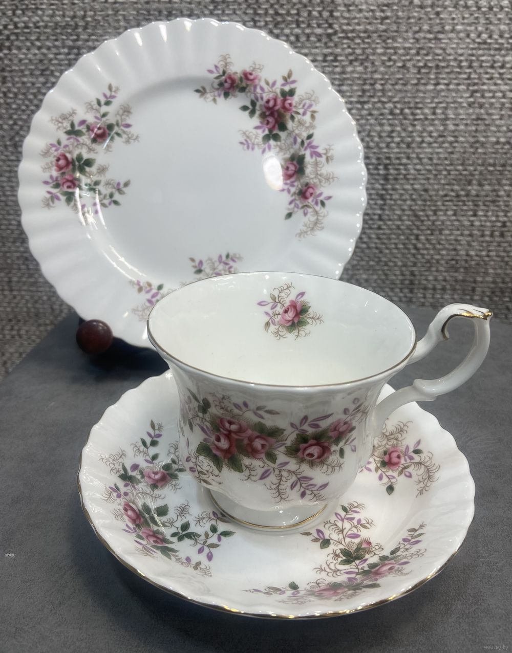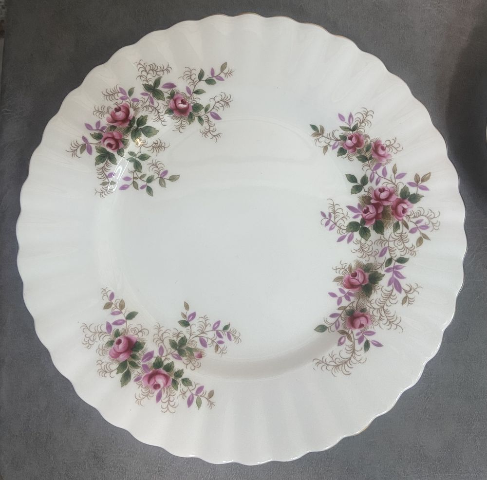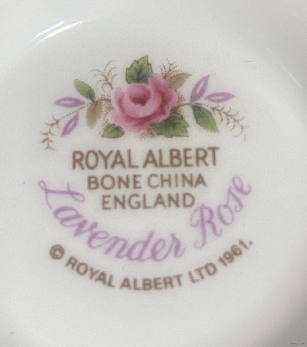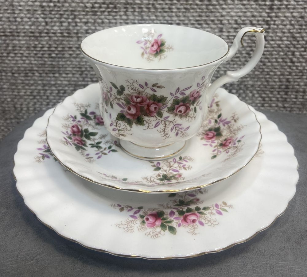 Чайная тройка Royal Albert Lavender Rose 1961 год. Англия. Чашка 9х7 см. Блюдце 14 см. Тарелка для торта 18 см.
