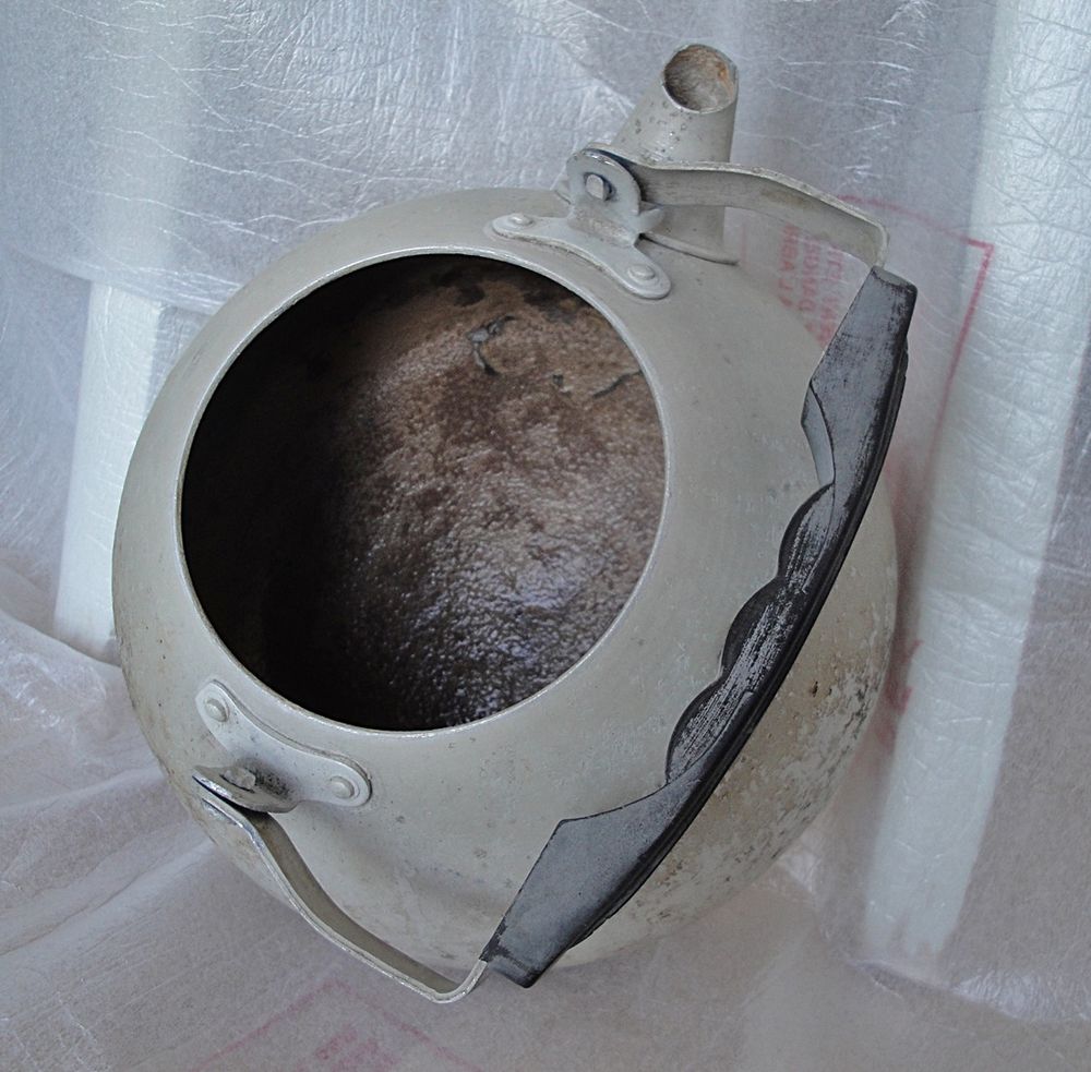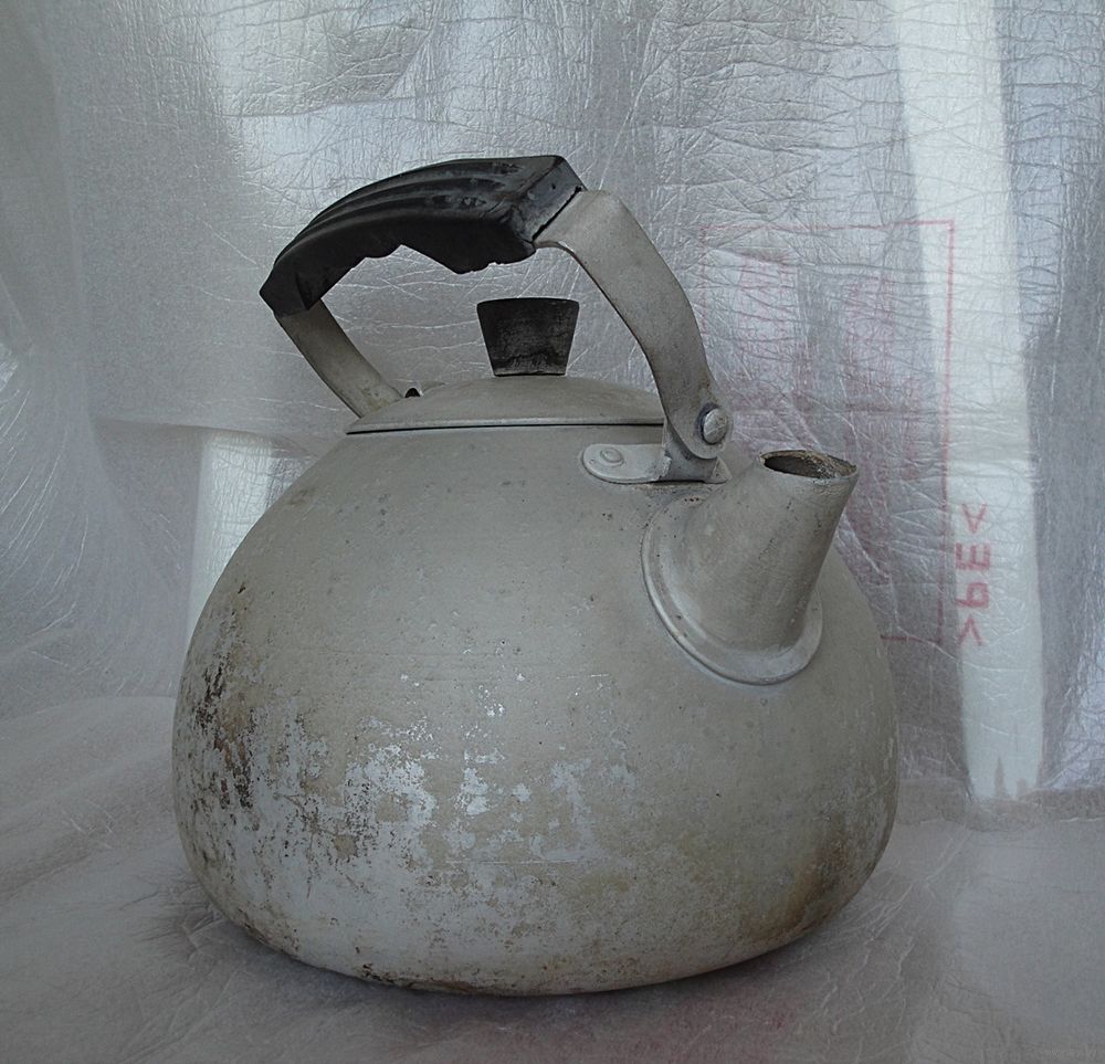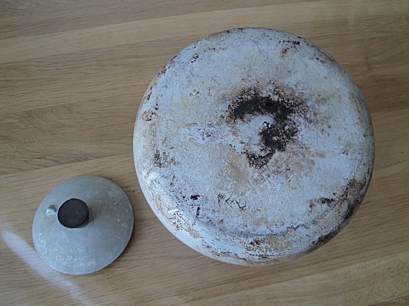 До носика заливается 2,5 литра, по клейму вроде как на 3 литра? Внутри накипь, но внешне крепкий, т.ч. если почистить, ещё послужит.