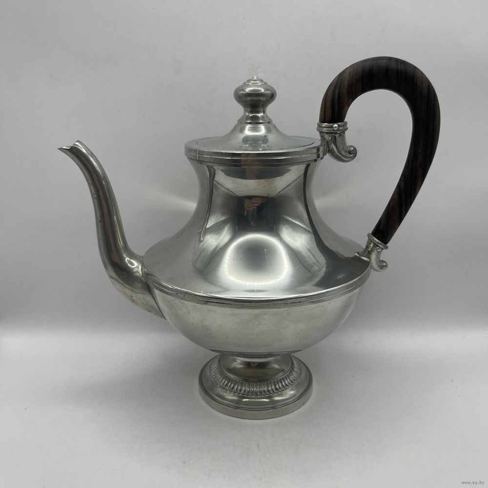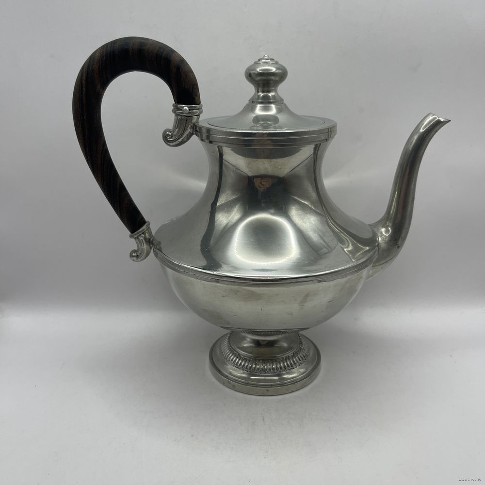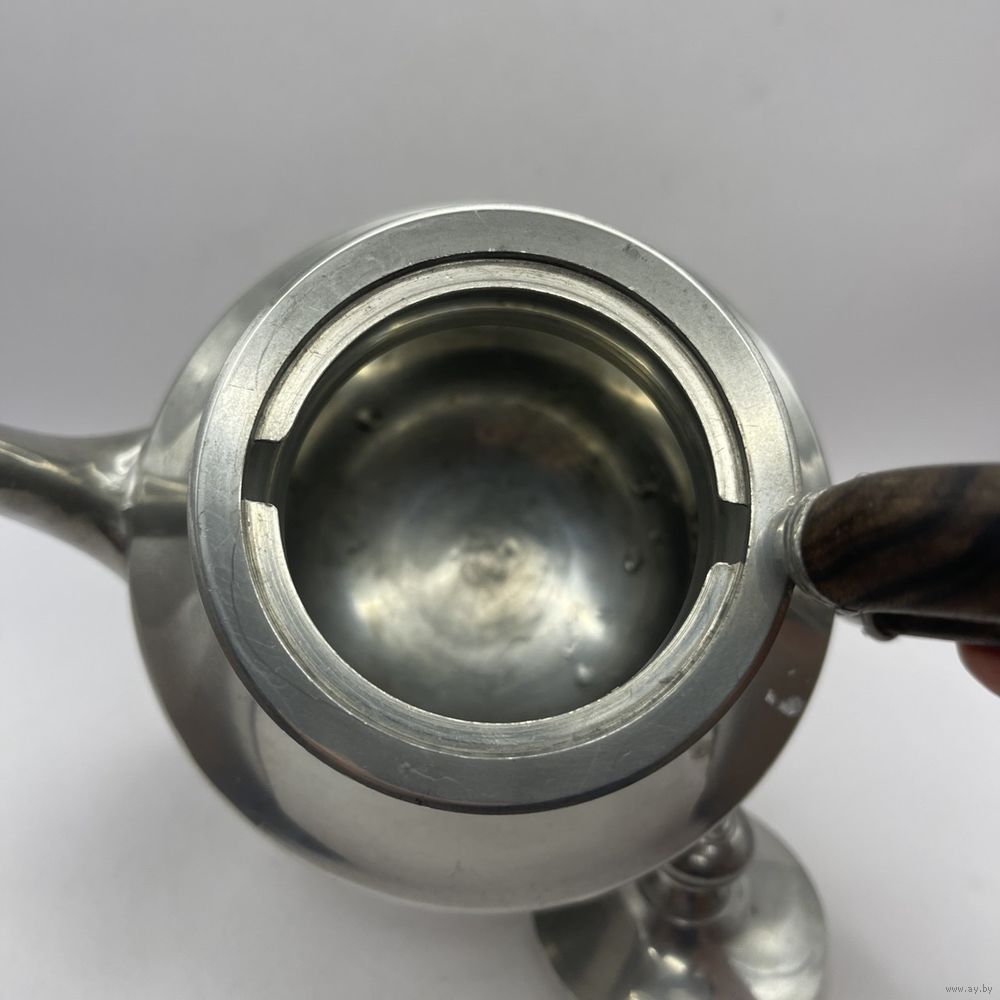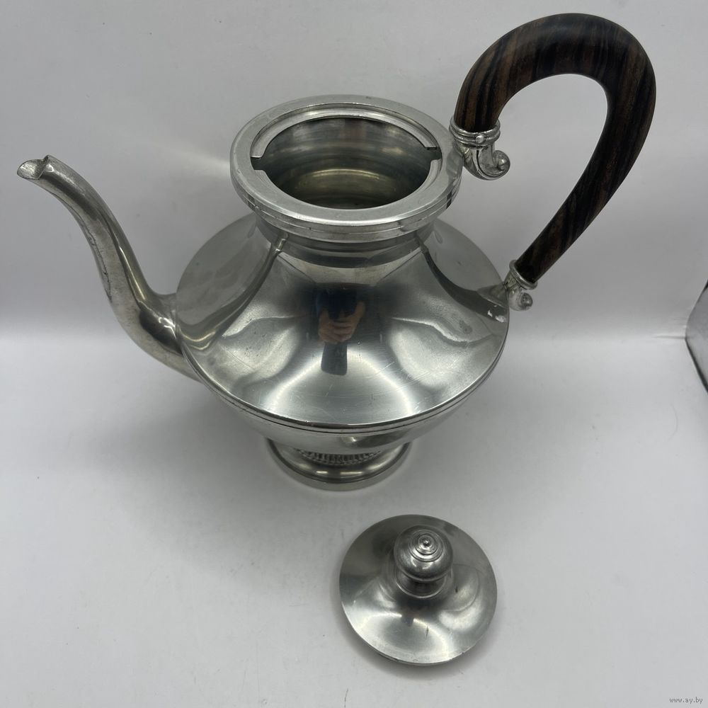 Антикварный чайник/кофейник Irrmann из высококачественного посеребренного олова ручной полировки в стиле Ар-деко. Фигурная ручка ручной работы выполнена из ценных пород дерева. С фильтром для заварки. Франция. Клейма (периода 1930-1940-х). Высота 19,5 см, ширина ручка-носик 21 см, объем 750 мл.