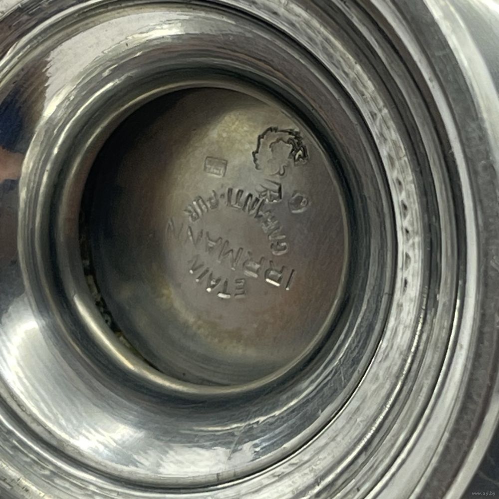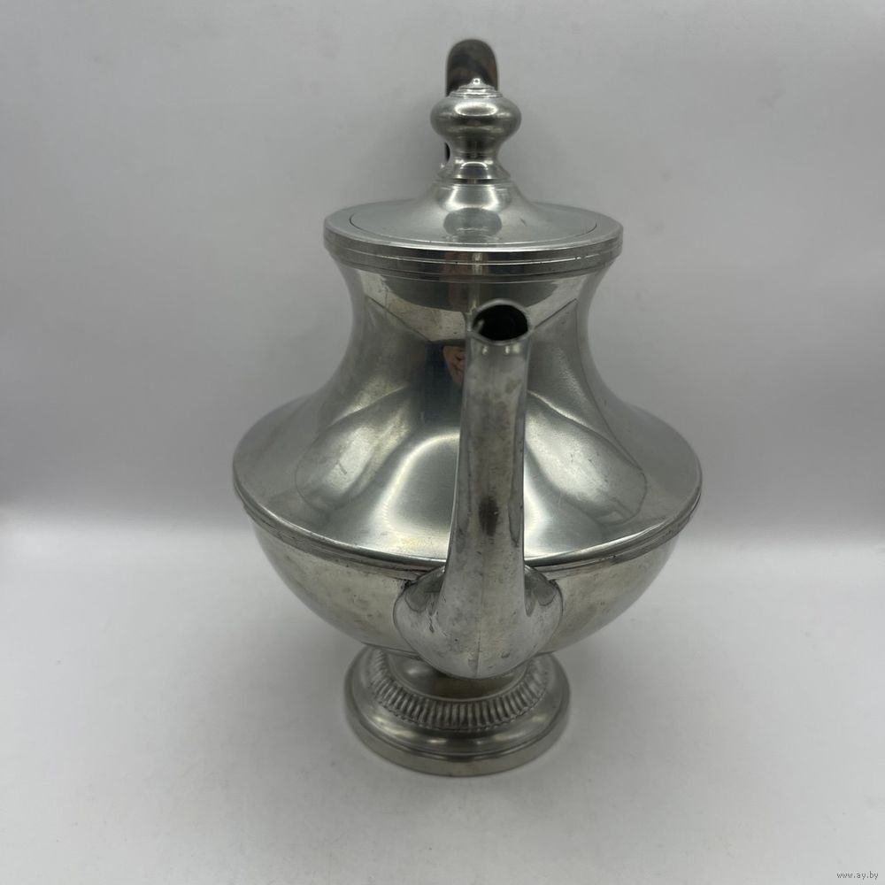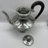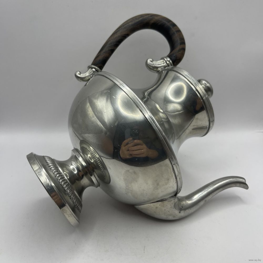 Антикварный чайник/кофейник Irrmann из высококачественного посеребренного олова ручной полировки в стиле Ар-деко. Фигурная ручка ручной работы выполнена из ценных пород дерева. С фильтром для заварки. Франция. Клейма (периода 1930-1940-х). Высота 19,5 см, ширина ручка-носик 21 см, объем 750 мл.